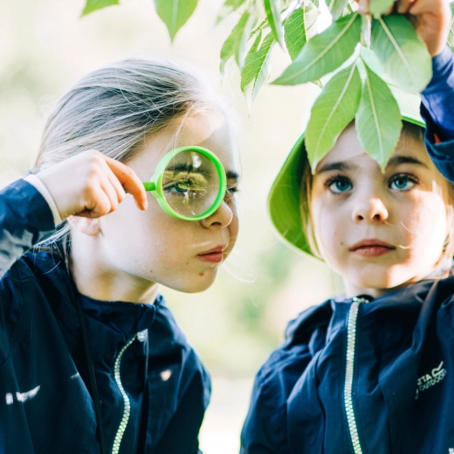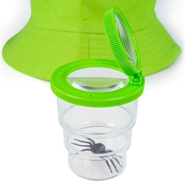 Palielināmais stikls un caurspīdīgs trauciņš ar vāciņu ļauj bērniem pētīt sīkas detaļas pavisam tuvu, vienlaikus saudzējot dabu.