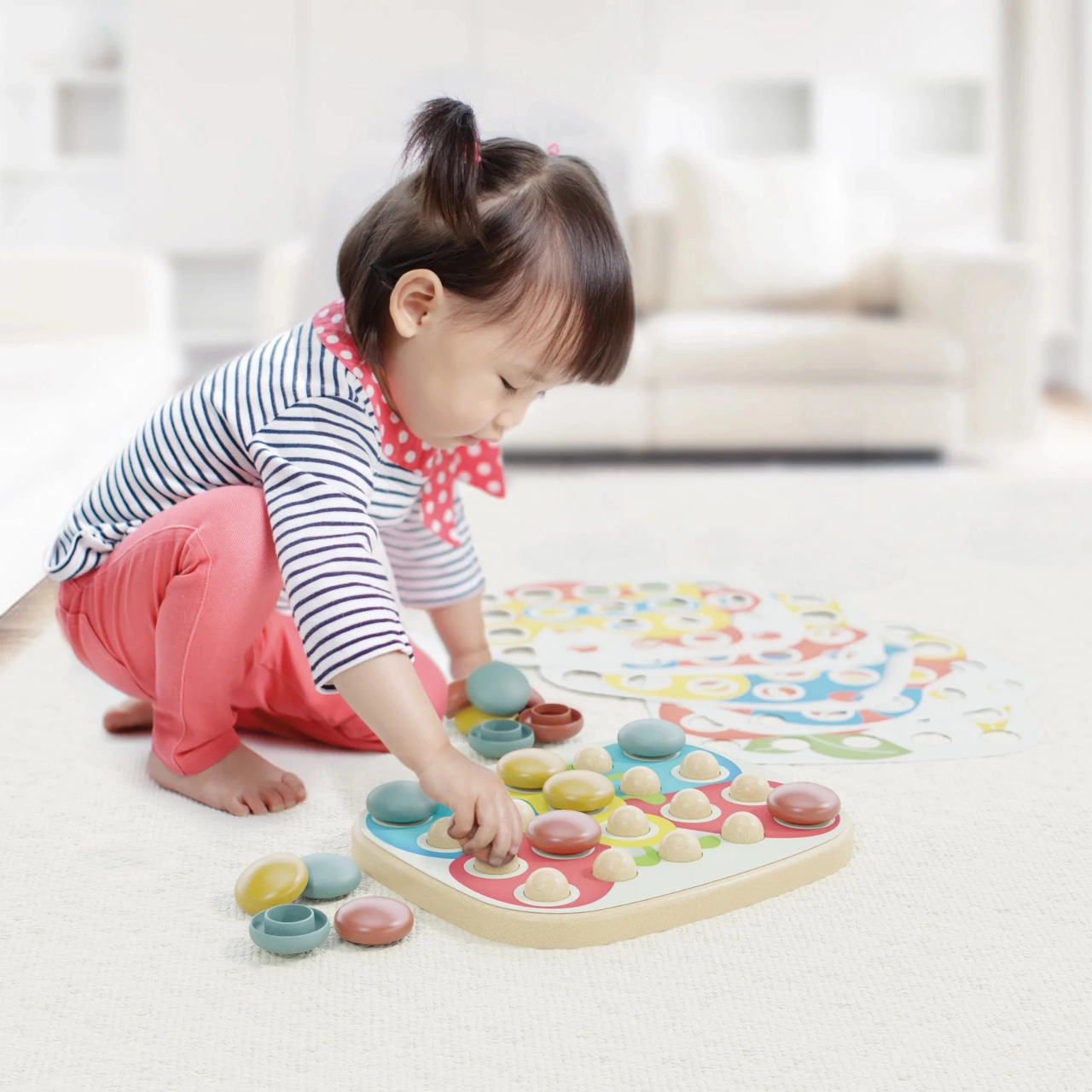 Katra mozaīkas detaļa palīdz attīstīt roku-acu koordināciju un sīkās motorikas iemaņas, izmantojot dažādu krāsu tapītes.