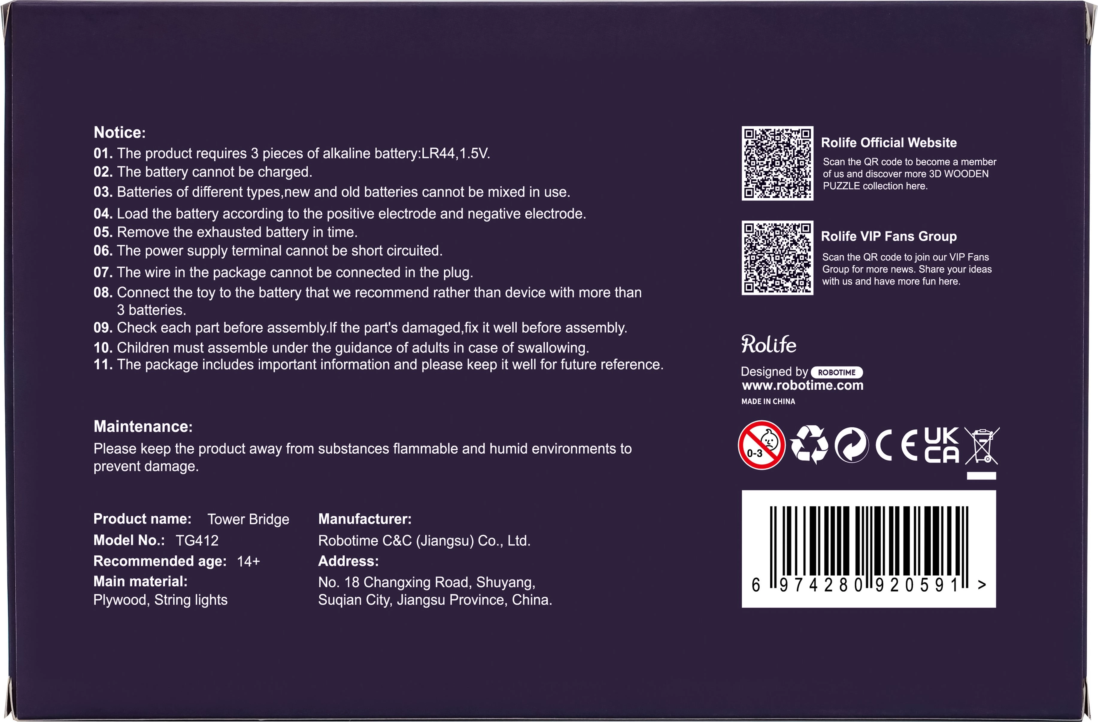 Iebūvētais LED komplekts patīkami izgaismo torņus un tilta laidumus, izceļot arhitektoniskās detaļas. Barošanu nodrošina 3× LR44 (baterijas nav iekļautas komplektā).