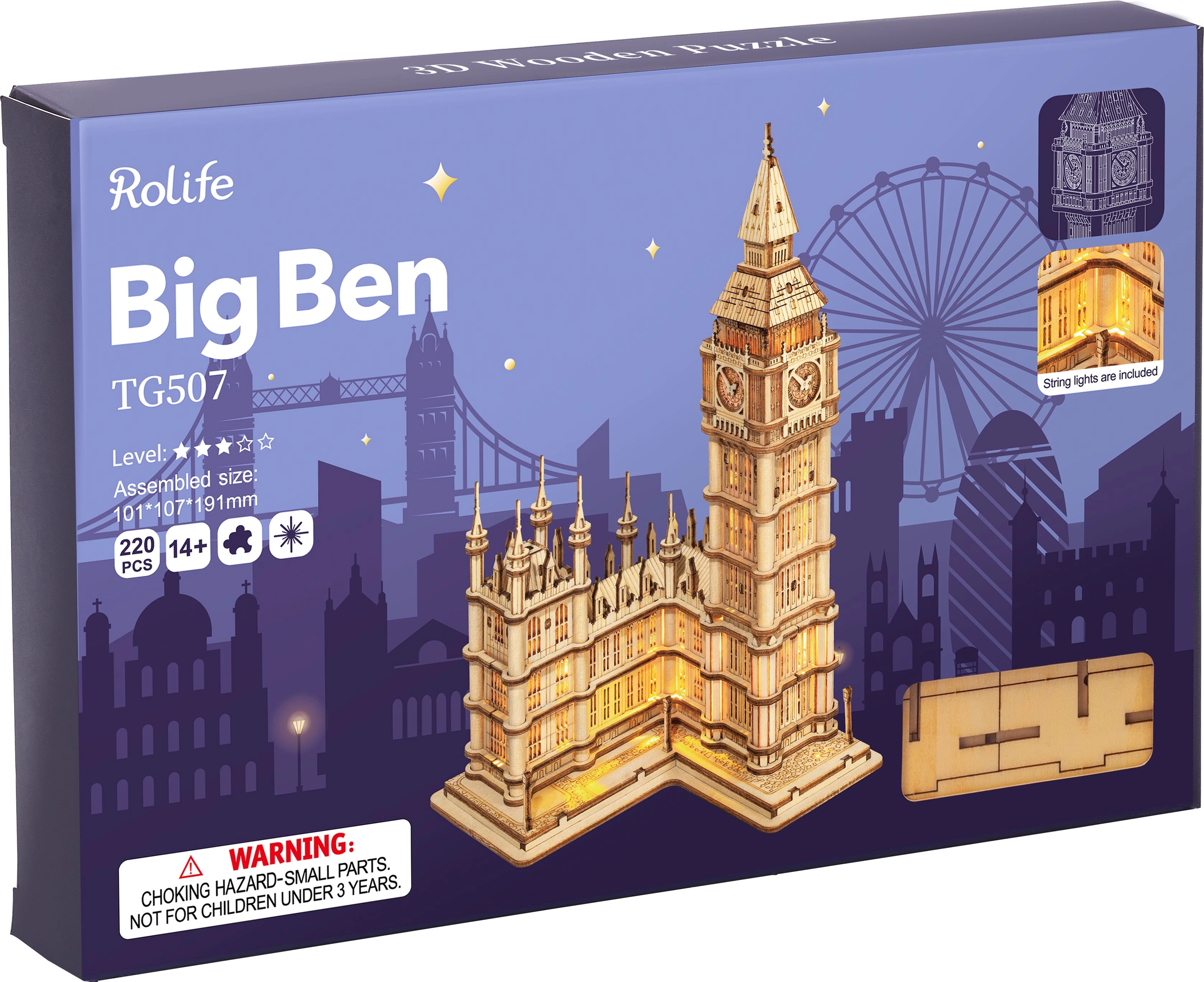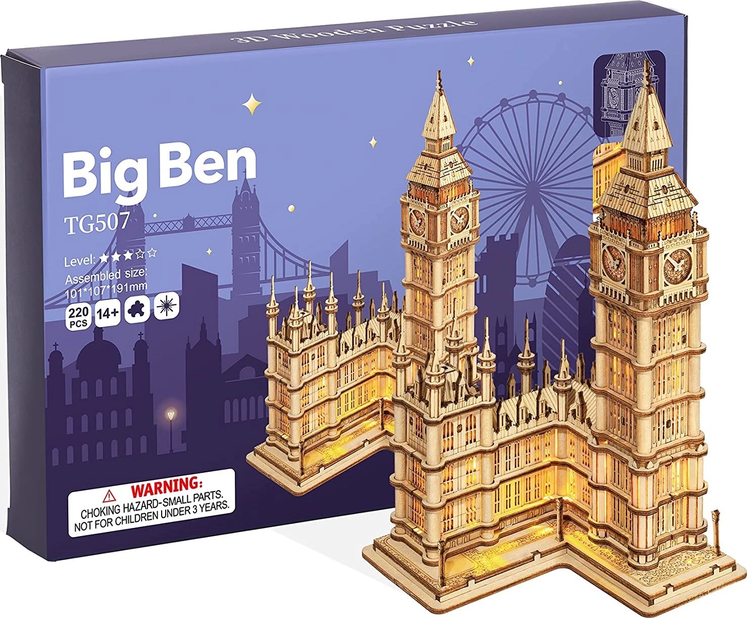Atklājiet vēsturiskās arhitektūras burvību ar koka 3D puzli Big Ben. Pateicoties smalkām detaļām, precīziem savienojumiem un integrētajam LED komplektam, top iespaidīga slavenā Londonas torņa miniatūra, kas iedegta rada vakara pilsētas noskaņu. Konstruktors ir lieliska izvēle prasmīgiem entuziastiem no 14 gadu vecuma, kā arī reprezentabla dekorācija darba kabinetam, viesistabai vai vitrīnai.