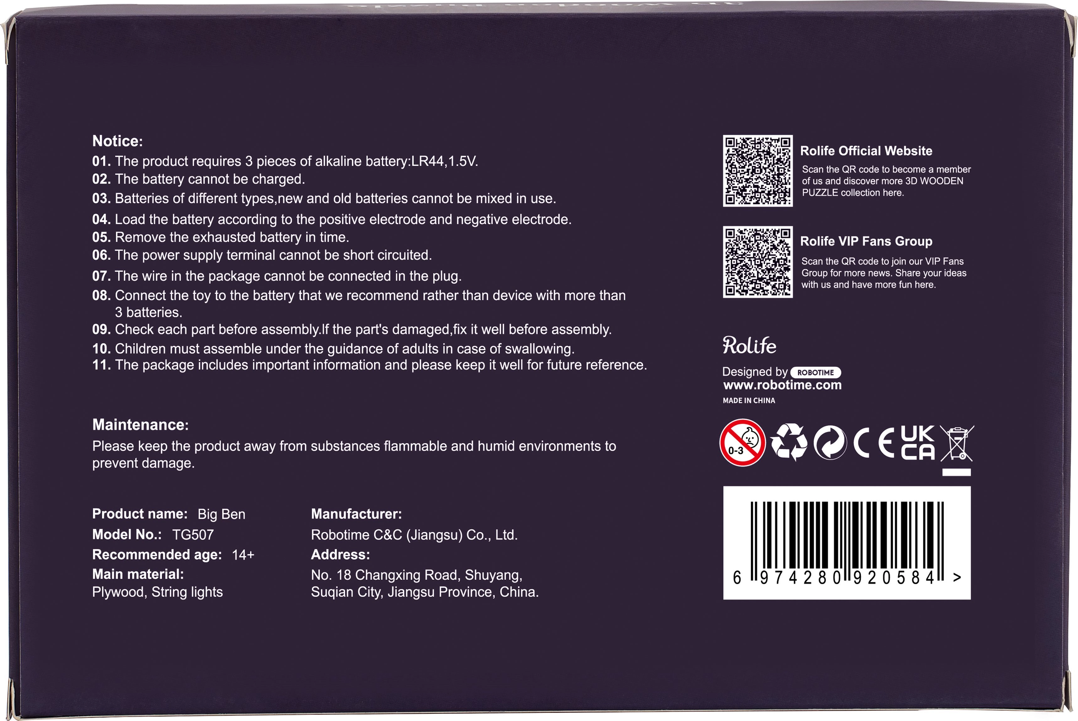 Integrētais LED komplekts izgaismo modeļa logus un izceļ slavenā pulksteņa torņa detaļas. Droša barošana ar pogveida baterijām 3 × LR44 (nav iekļautas komplektā).