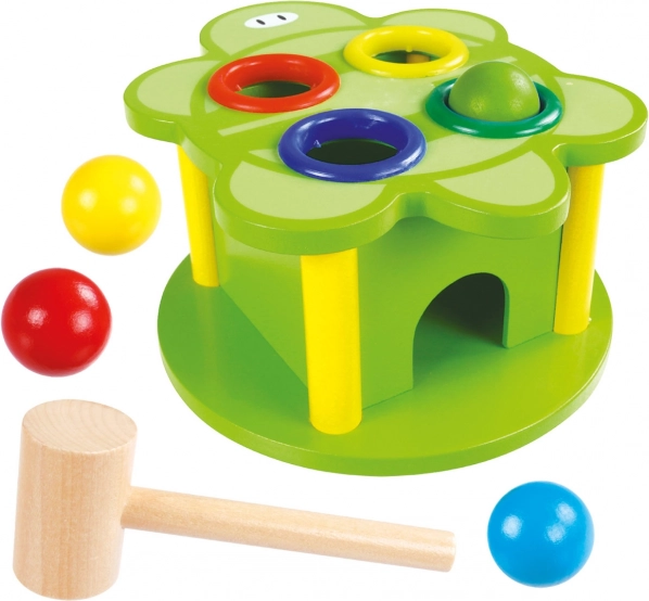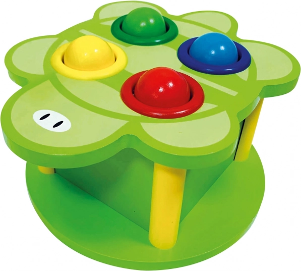 Bumbiņu dauzīšana ar koka āmuriņu veicina smalko motoriku, roku–acu koordināciju un satvēriena spēku.