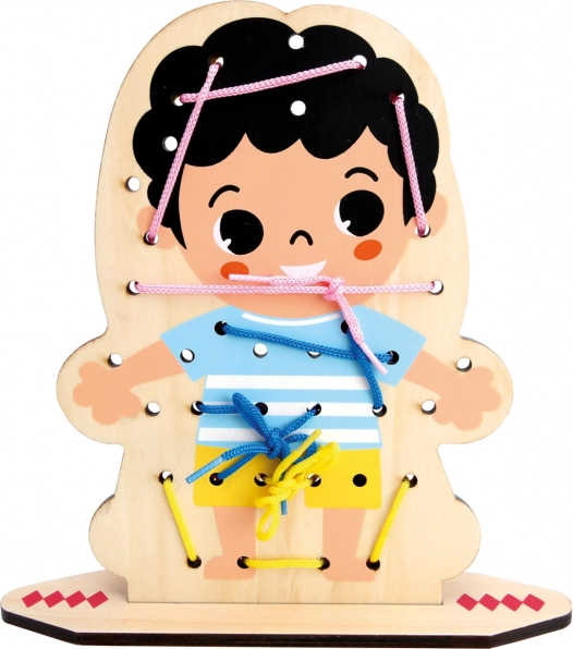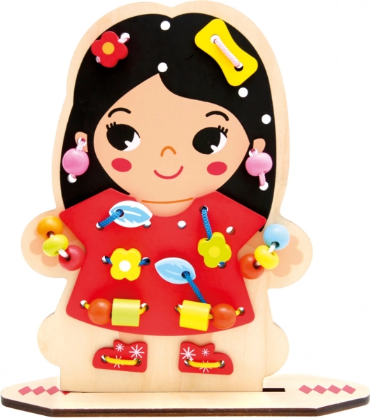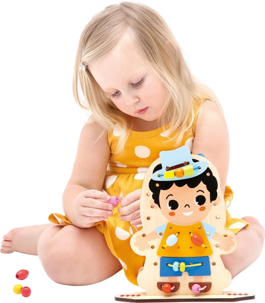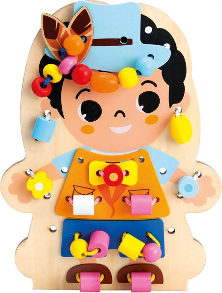 Kvalitatīvs koka dēlītis un tekstila elementi nodrošina ilgu kalpošanas laiku un drošas rotaļas bērniem no 3 gadu vecuma.