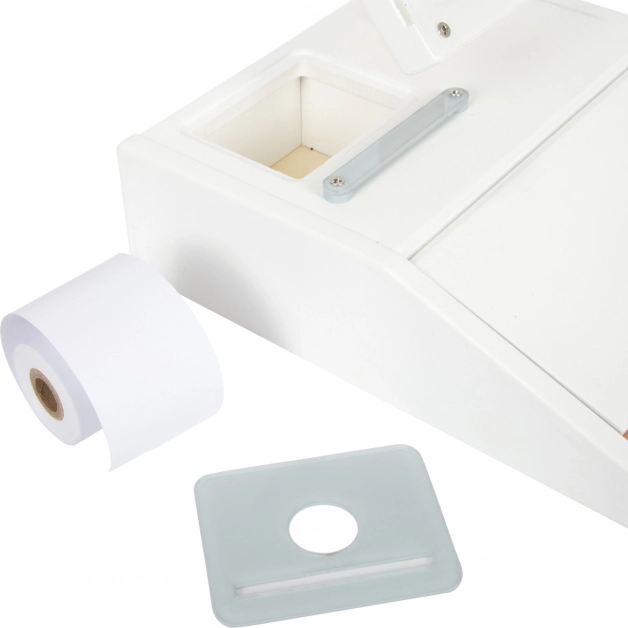 Integrēts kalkulators grozāmā monitorā, noplēšama čeku lente un kartes ievades slots ļauj bērniem izdzīvot īstu pirkuma procesu – no preces noskenēšanas līdz čeka izdrukai.