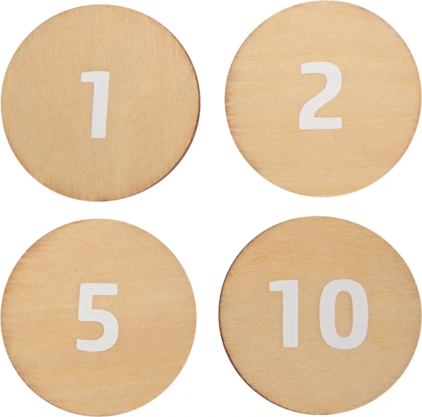 Abpusējas koka monētas un produktu kartītes palīdz bērniem trenēt skaitīšanu, vērtību atpazīšanu un pamata finanšu pratību rotaļīgā veidā.