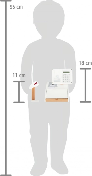 Stilīgs bērnu kases aparāts no izturīga koka ar reālistiskiem piederumiem veikala rotaļām. Komplektā ir funkcionāls kalkulators, atverams atvilktnes nodalījums, svītrkodu lasītājs, skeneris, norēķinu karte, produktu kartītes un abpusējas koka monētas. Lieliski piemērots matemātikas un finanšu pratības attīstīšanai bērniem no 3 gadu vecuma.