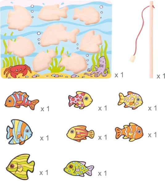 • Pilns komplekts: koka plāksne, magnētiskā makšķere un zivtiņas – kopā 10 detaļas