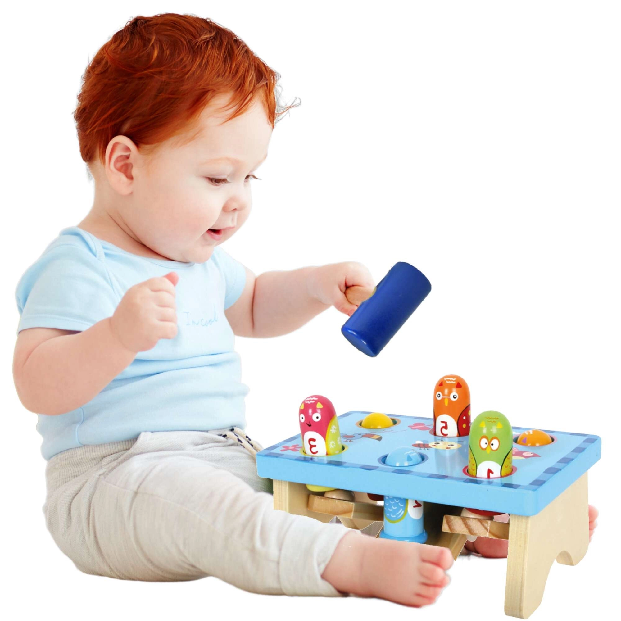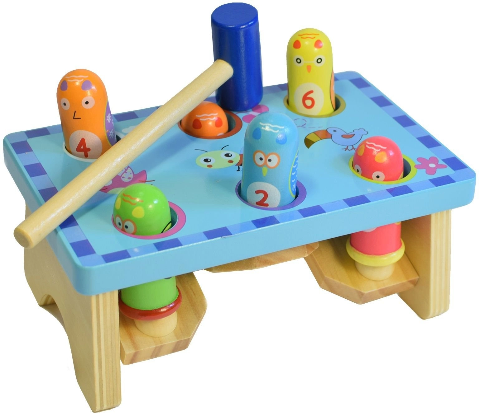 Pateicoties izturīgajam izpildījumam un ergonomiskajam āmuriņam, bērni trenē sīko motoriku, kustību koordināciju un pacietību. Krāsainās un numurētās tapas palīdz krāsu atpazīšanā un skaitīšanā, tāpēc rotaļas dabiski savienojas ar mācīšanos.