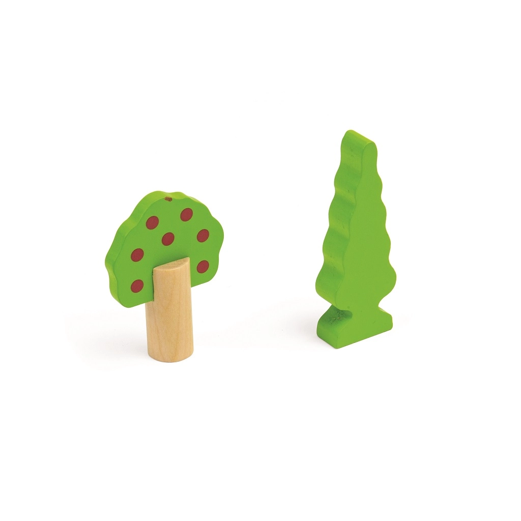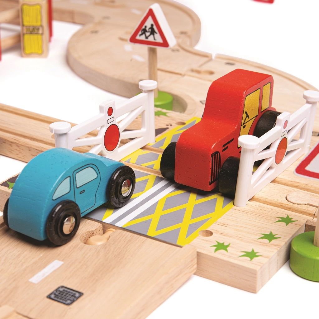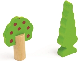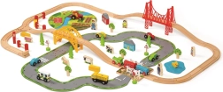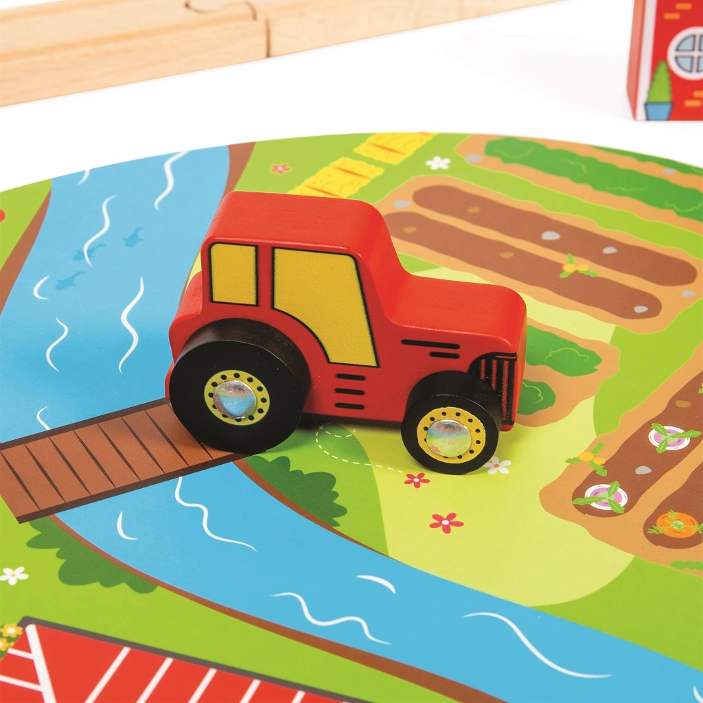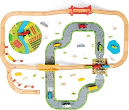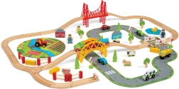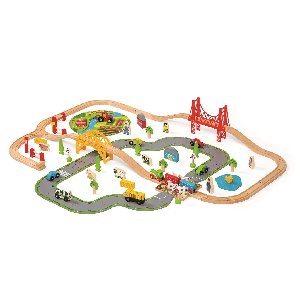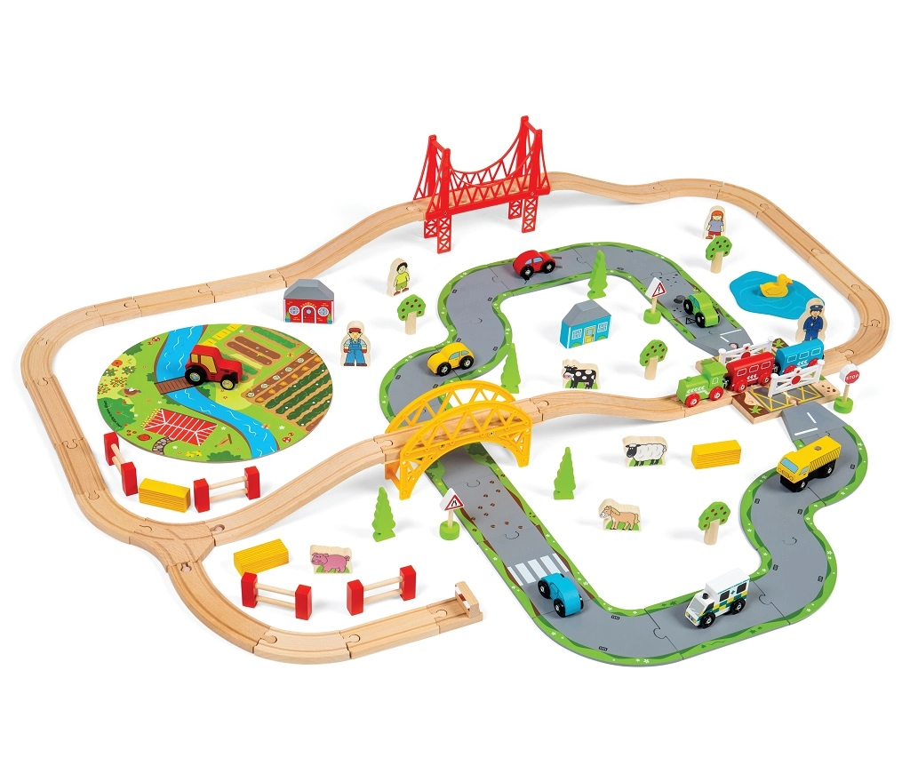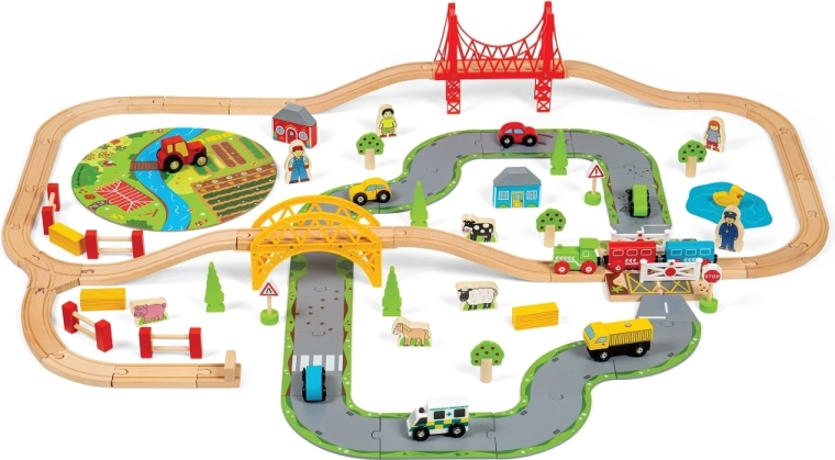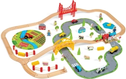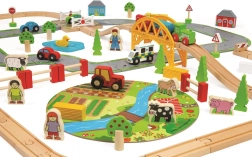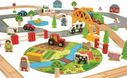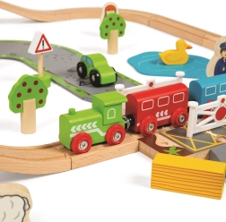Šī koka vilciena trase ar lauku ceļu ir perfekta vilciena un auto trases apvienojums, kas atdarina īsto satiksmes pasauli. Pateicoties tiltiem un pārbrauktuvēm, bērni dosies piedzīvojumos, kas pilni ar jautrību. Komplektu papildina vietējie elementi, piemēram, saimniecība, ēkas un koki, kas izdaiļo apkārtni.