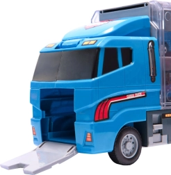 Zilais kravas auto ne tikai pārvadā līdz pat 14 transportlīdzekļiem, bet arī tā reālistiskās detaļas padara to par neatvairāmu rotaļlietu bērniem. Caurspīdamās durtiņas un palaišanas mehānisms piešķir spēlei papildu aizrautību.