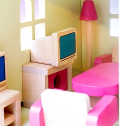 Šis koka mēbeļu komplekts leļļu namiņam ir ideāls risinājums ikvienam mazajam interjera dizaineram. Komplektā ir viss nepieciešamais virtuves, viesistabas, guļamistabas, vannasistabas un pat bēniņu iekārtošanai.