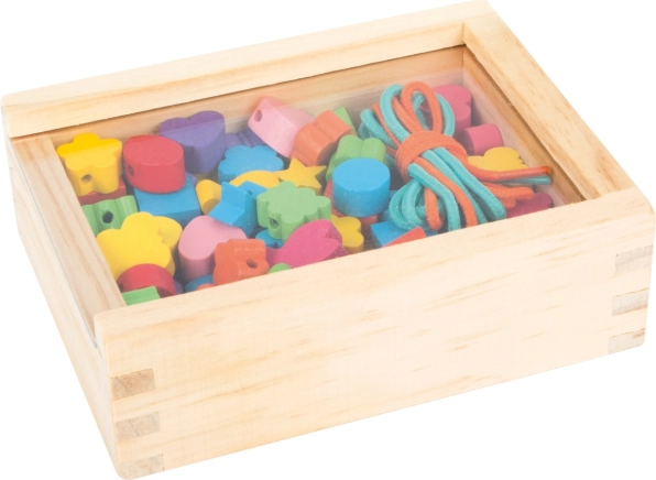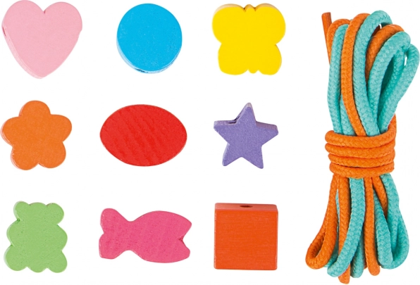 Mazie radošie prāti ar šo koka komplektu var pavadīt stundām ilgi jautri spēlējoties. Kastītē ir 81 krāsaina pērlīte un 2 aukliņas, kas ļauj bērniem veidot dažādus rotājumus pēc savas ieceres.