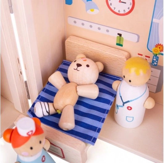 Šis kompaktais un pārnēsājamais rotaļu komplekts Lāču slimnīca ir ideāli piemērots mazajiem ārstiem. Koka konstrukcija ir izturīga un veidota no augstas kvalitātes materiāliem, kas atbilst visiem Eiropas drošības standartiem. Rotaļlieta ietver deviņus spēles elementus, kas bērniem ļauj veidot dažādus scenārijus un situācijas.