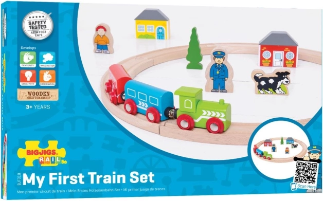 Atklājiet pirmo braucienu burvību ar šo krāsaino koka vilciena trasi no BIGJIGS RAIL. Komplektā ir 19 detaļas, tostarp lokomotīve, vagoni, magnētiskās sakabes un piederumi, piemēram, mājas, koki un figūriņas. Piemērots bērniem no 3 gadu vecuma, veicina iztēli, smalko motoriku un koordināciju. Izgatavots no kvalitatīviem, atbildīgi iegūtiem materiāliem un ir saderīgs ar lielāko daļu koka vilcienu trašu tirgū.