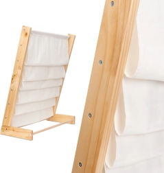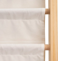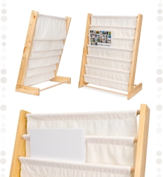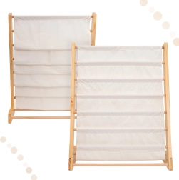 Stilīgs bērnu plaukts Montessori stilā ar tekstila kabatām nodrošina vieglu piekļuvi iemīļotajām grāmatām, pārskatāmu uzglabāšanu un drošu lietošanu. Dabīgs koks un kvalitatīvs kokvilnas audums veido izturīgu un laikmetīgu mēbeli, kas veicina bērna patstāvību un rada kārtību bērnu istabā.