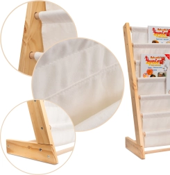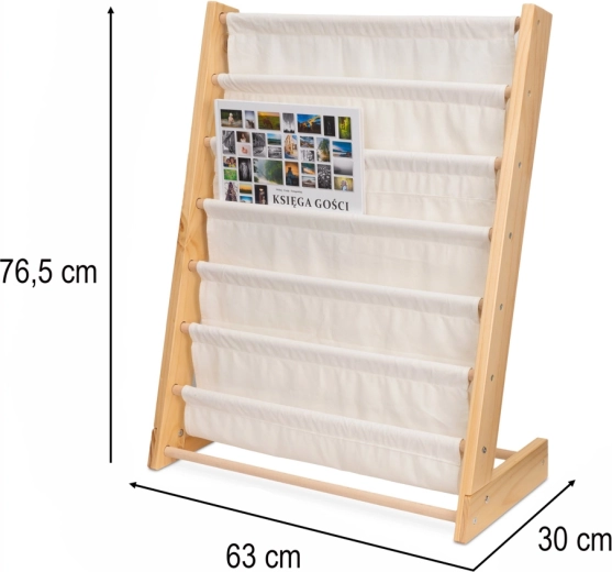 Plaukts izgatavots no dabīga koka un kvalitatīva kokvilnas auduma, tam ir gludas malas un stabila konstrukcija maksimālai drošībai. Laikmetīgais koka un baltās krāsas salikums saskan ar jebkuru interjeru un veicina veselīgus lasīšanas ieradumus un kārtības mācīšanos.