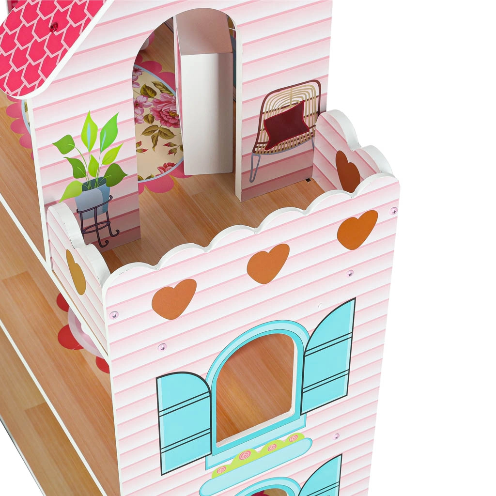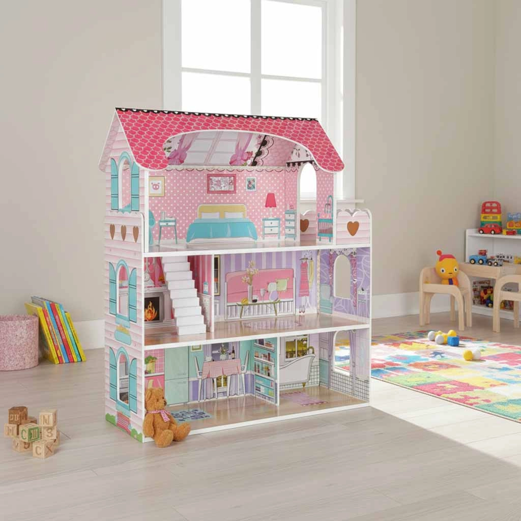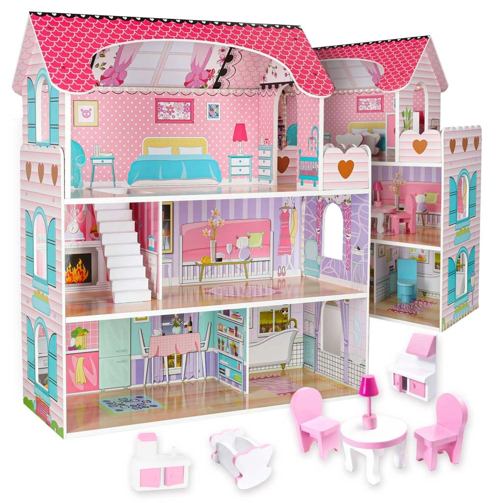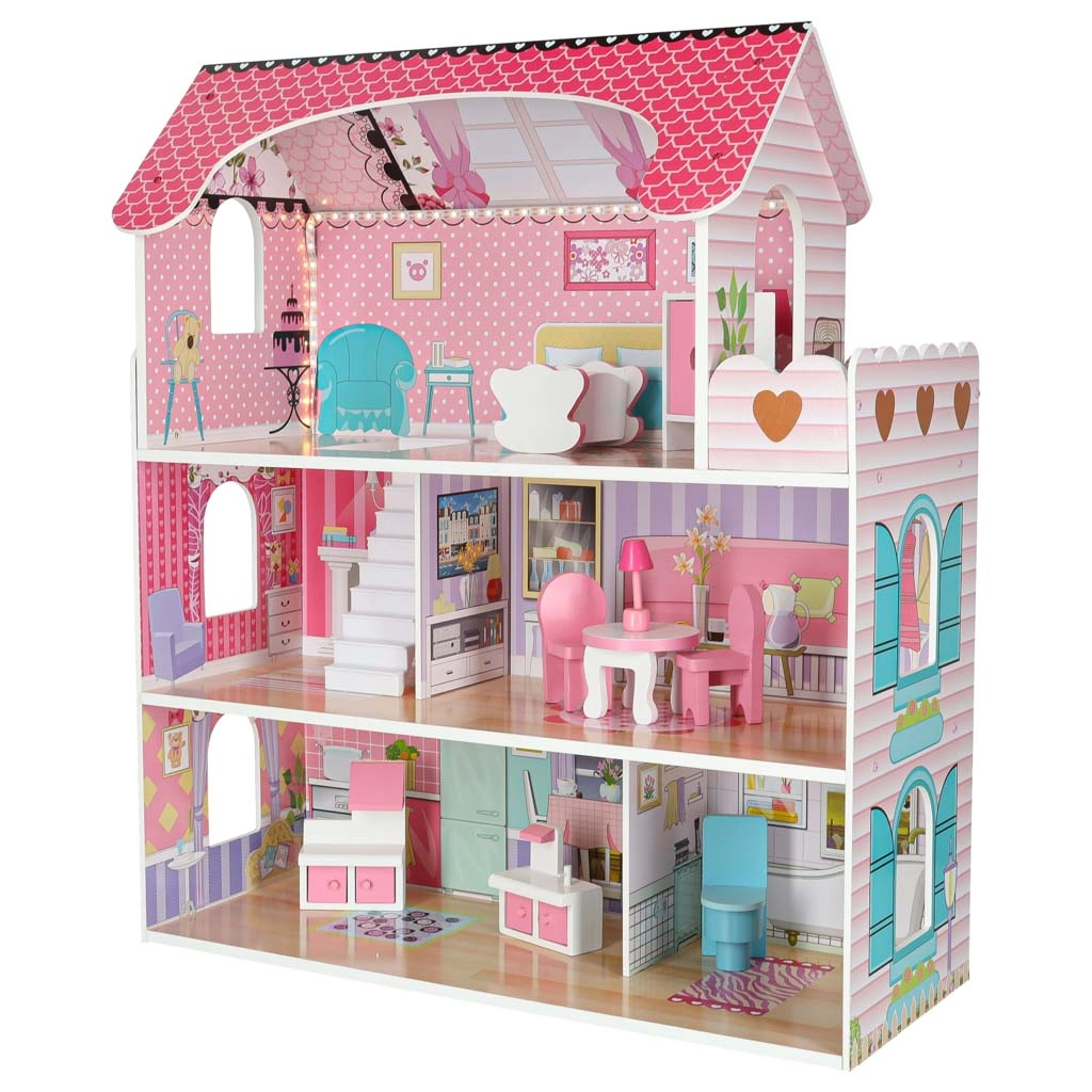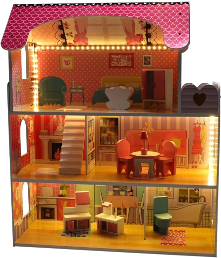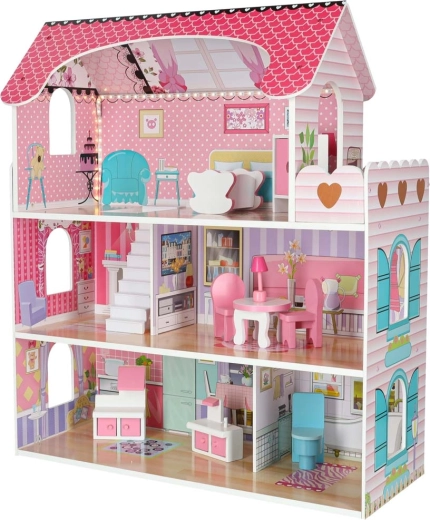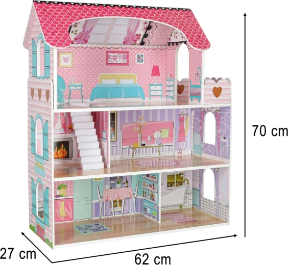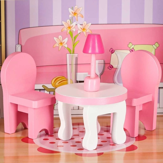Liela koka leļļu māja iepriecinās gan bērnus, gan vecākus. Trīs plaši stāvi ietver virtuvi, vannas istabu, guļamistabu, viesistabu un kāpnes ar balkonu. Bagātīgais koka piederumu komplekts un reālistiskās sienu apdrukas veicina radošu lomu spēli un sīko motoriku.