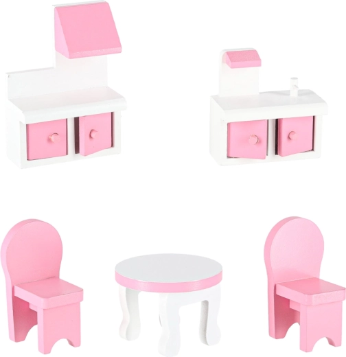 Komplektā ir skapīši ar atveramām durtiņām, virtuves iekārta, galds un krēsli, šūpulītis, lampa un tualete – viss no gludi apstrādāta koka ar smalkām detaļām.
