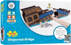 Bigjigs Rail kuģa vraka tilts piešķir jūsu dzelzceļa pasaulei piedzīvojumu noskaņu. Divas izturīgas daļas viegli saliekamas iespaidīgā pārmijā vai caurbraucamā tunelī, lai vilcieni varētu braukt gan pāri, gan cauri dekorētajam vrakam. Pirātu un jūras viļņu tēma rosina radošus stāstus un stundām ilgu izklaidi.