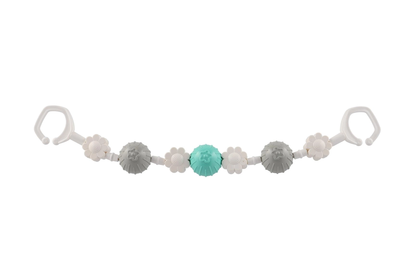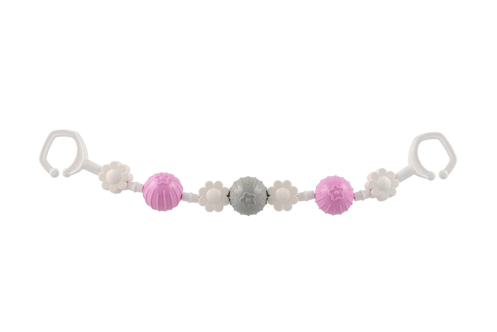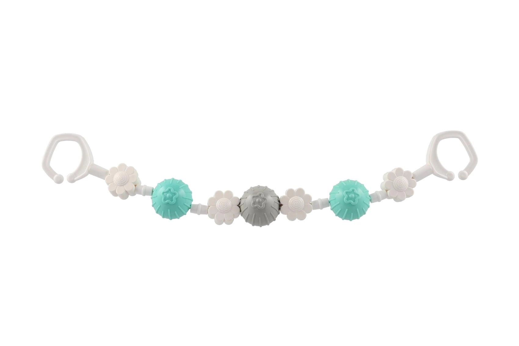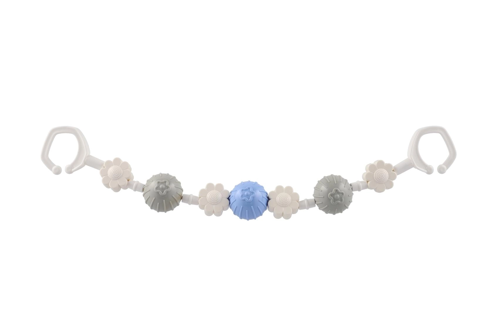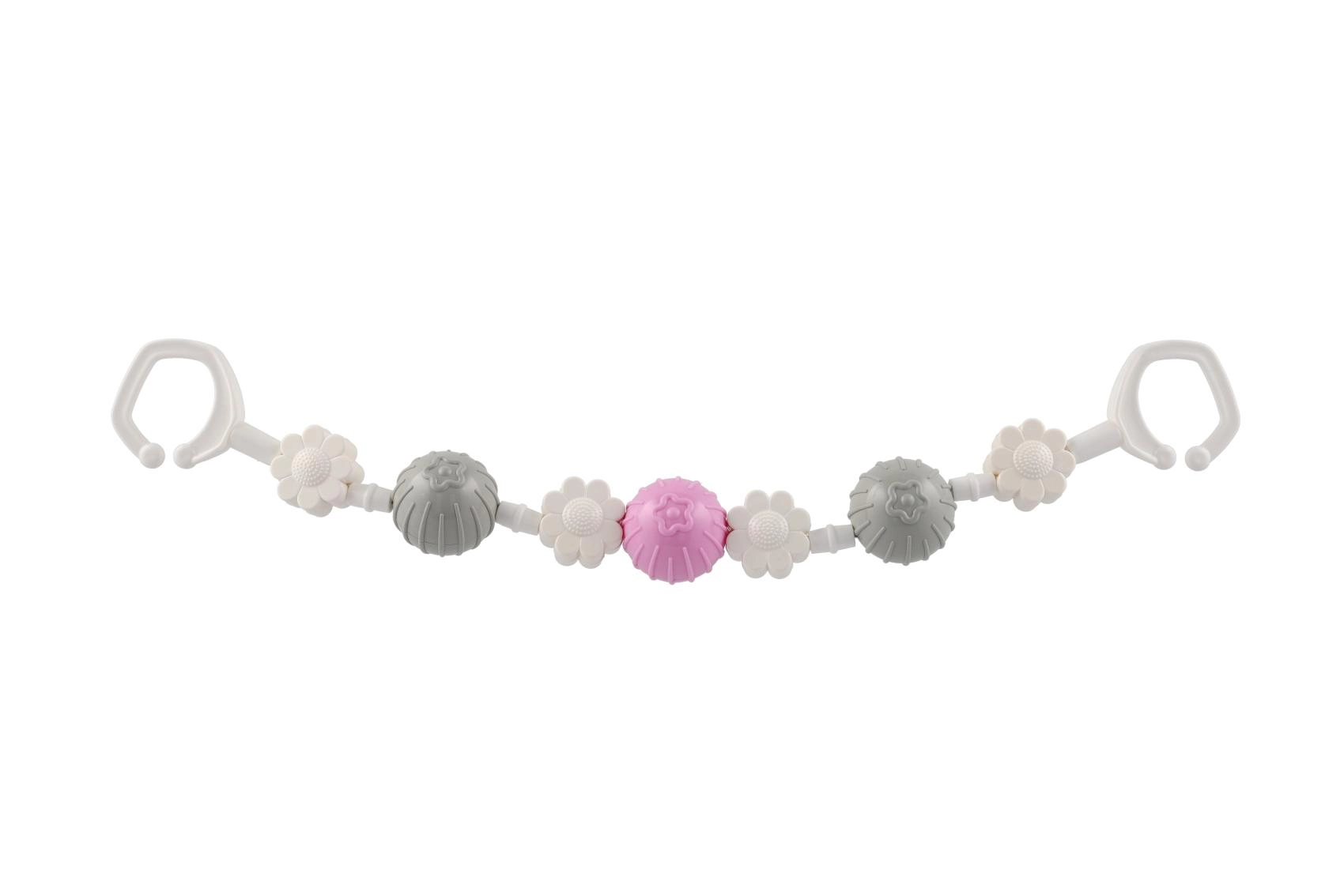 Piemīlīga piekarināma rotaļlieta ratiņiem ar rotējošām bumbiņām un ziediem piesaista mazuļa uzmanību jau no pirmā acu uzmetiena. Pateicoties klipšiem abos galos, to viegli piestiprināt pie ratiņiem vai gultiņas, un mazuli iepriecina maiga grabēšana un dažādas tekstūras sensorajai stimulācijai. Viegla, droša un viegli kopjama – ideāls ceļabiedrs.