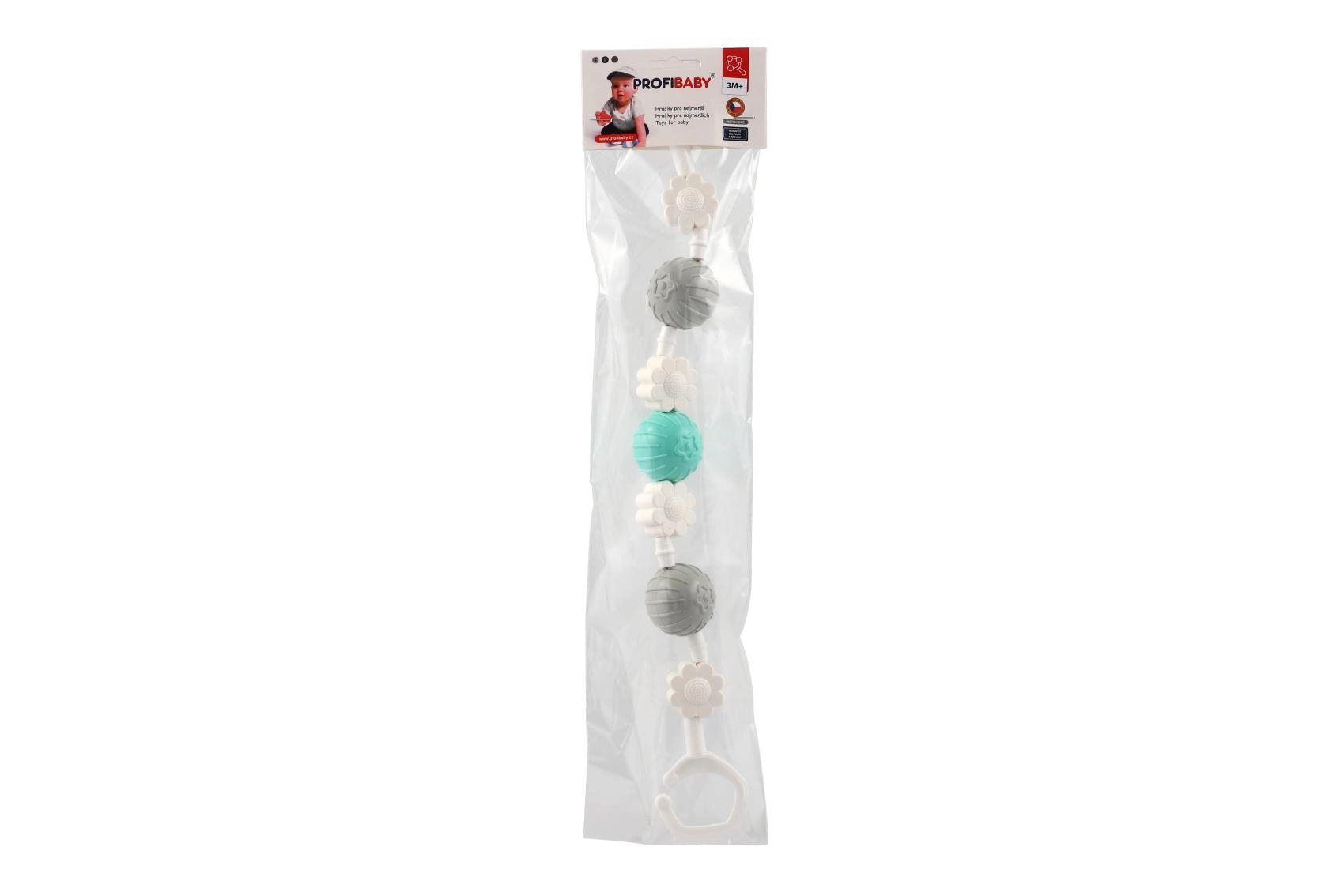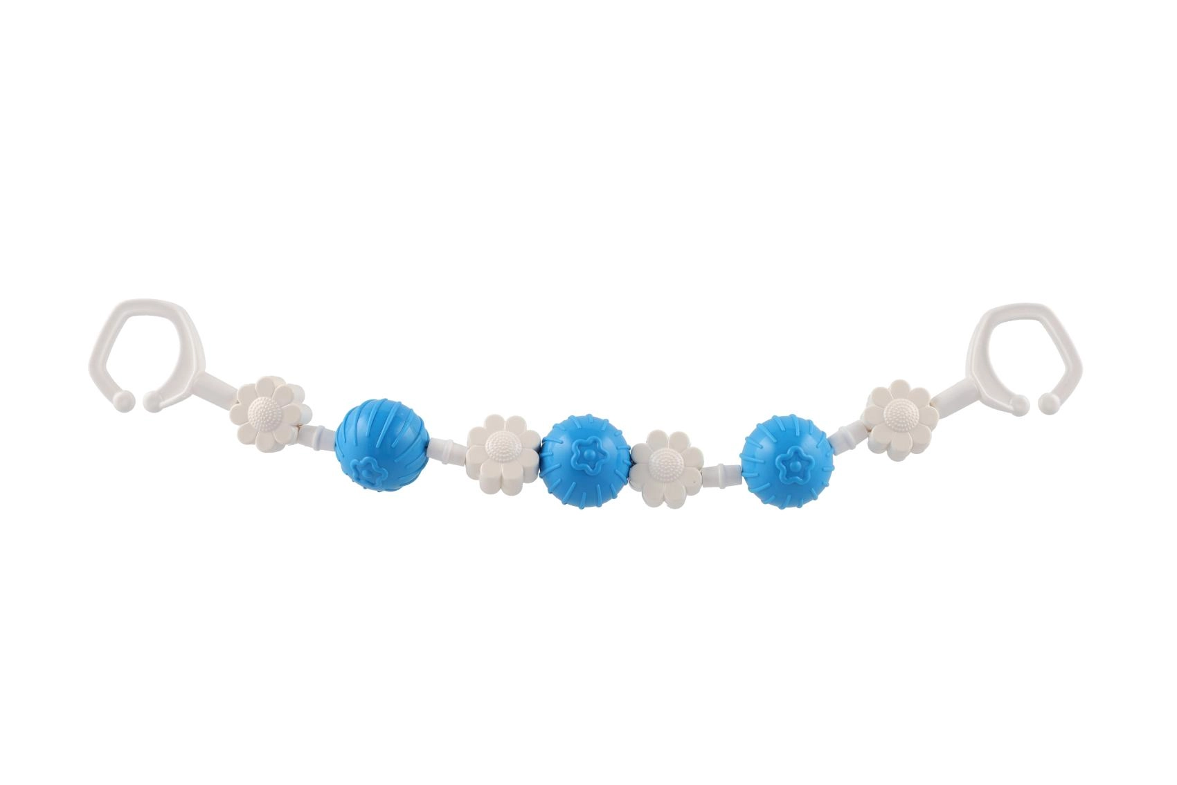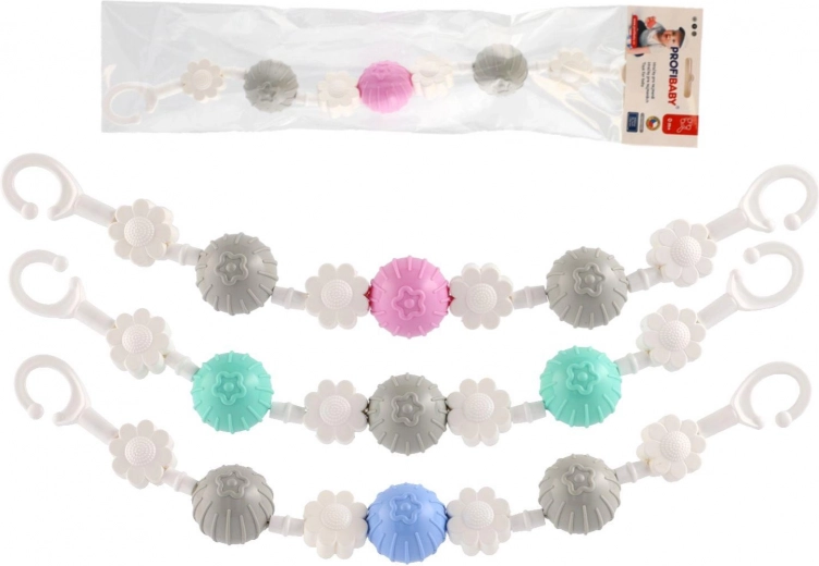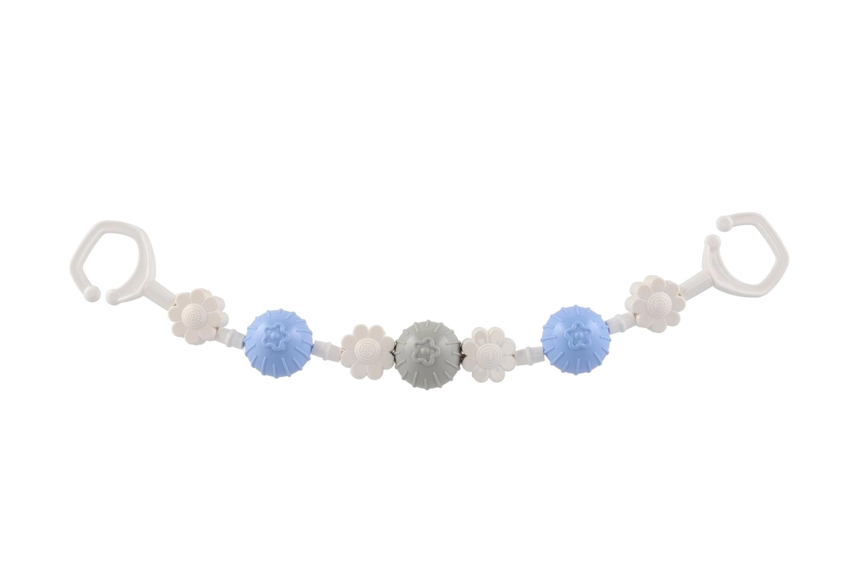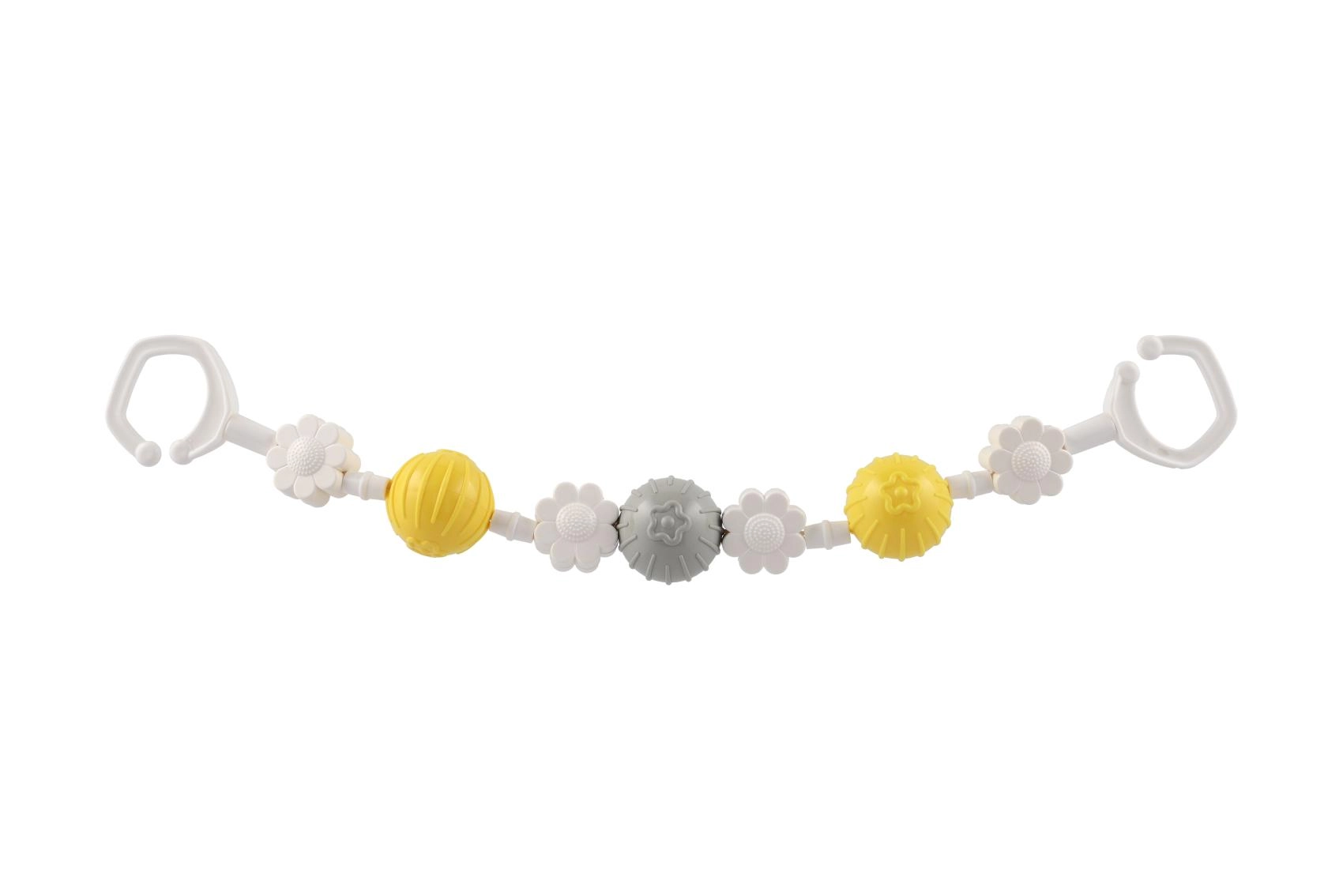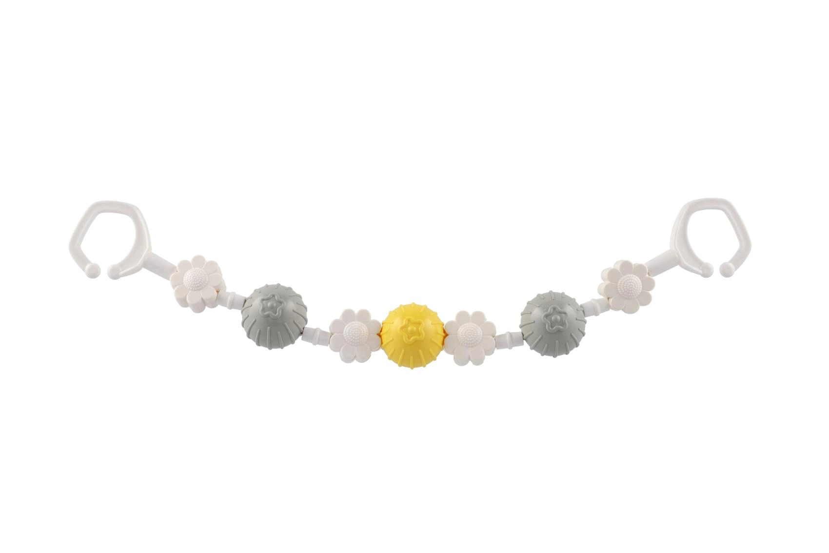 Piemīlīga piekarināma rotaļlieta ratiņiem ar rotējošām bumbiņām un ziediem piesaista mazuļa uzmanību jau no pirmā acu uzmetiena. Pateicoties klipšiem abos galos, to viegli piestiprināt pie ratiņiem vai gultiņas, un mazuli iepriecina maiga grabēšana un dažādas tekstūras sensorajai stimulācijai. Viegla, droša un viegli kopjama – ideāls ceļabiedrs.