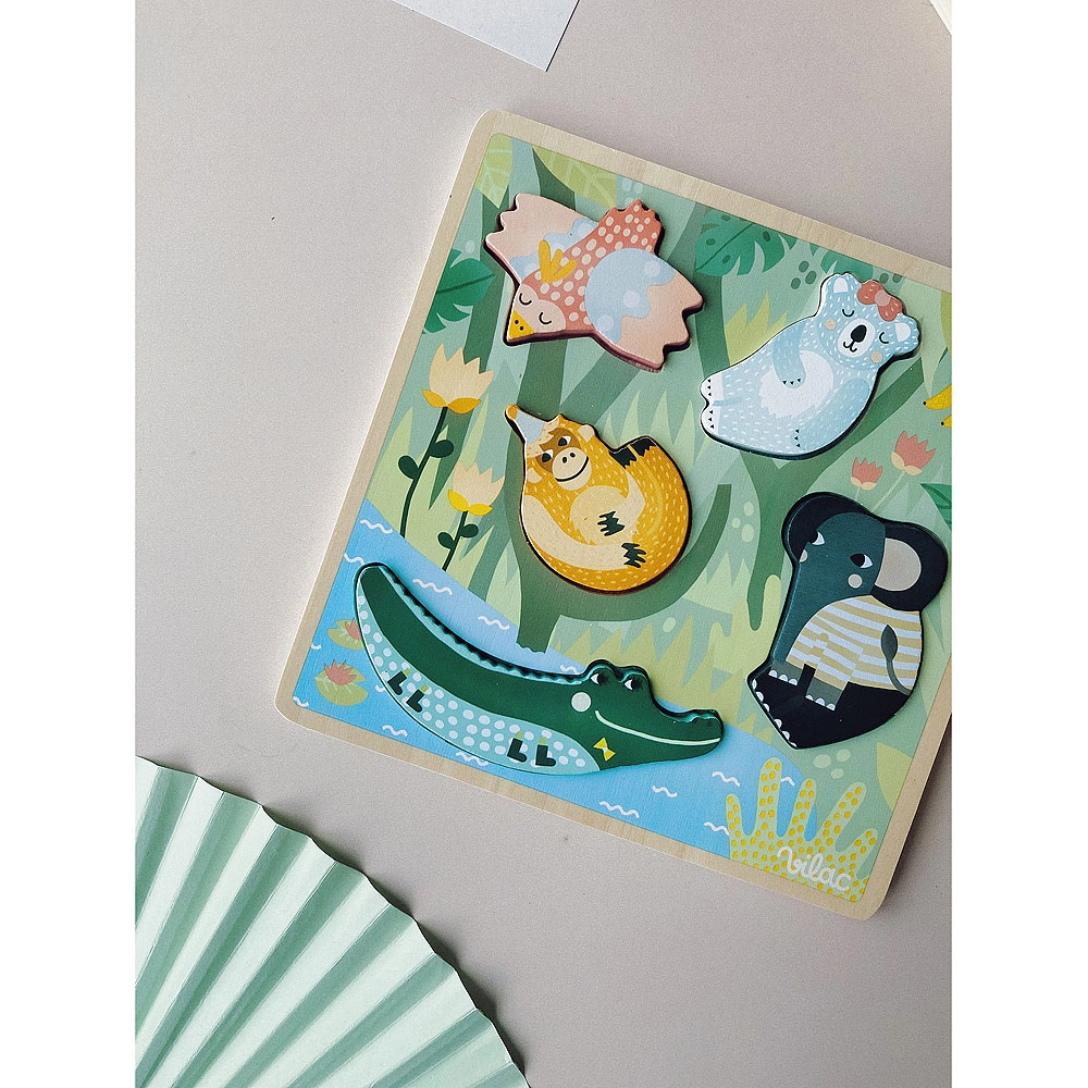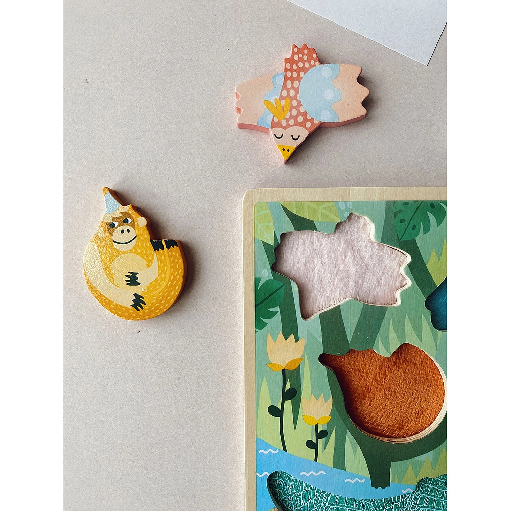 Šī kvalitatīvā koka puzle bērniem sniedz prieku no atklāšanas un mācīšanās. Izņemot katru dzīvnieciņu, zem detaļas atrodams atšķirīgs taustes pārklājums – maigs, raupjš vai reljefains, kas dabiski attīsta taustes sajūtas un veicina maņu integrāciju. Izturīgās, viegli satveramās detaļas lieliski piemērotas mazām rociņām.