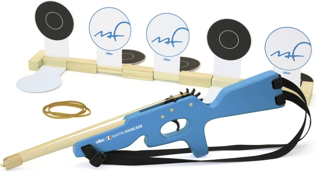 Koka šautene ir aprīkota ar regulējamām tekstila siksnām, ideāli pielāgojamām katram bērnam. Komplektā ietilpst pieci nolokāmi mērķi un divdesmit gumijas riņķīši atkārtotai šaušanai. Mēģiniet novietot mērķus dažādos attālumos un pārbaudiet savu precizitāti!