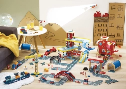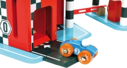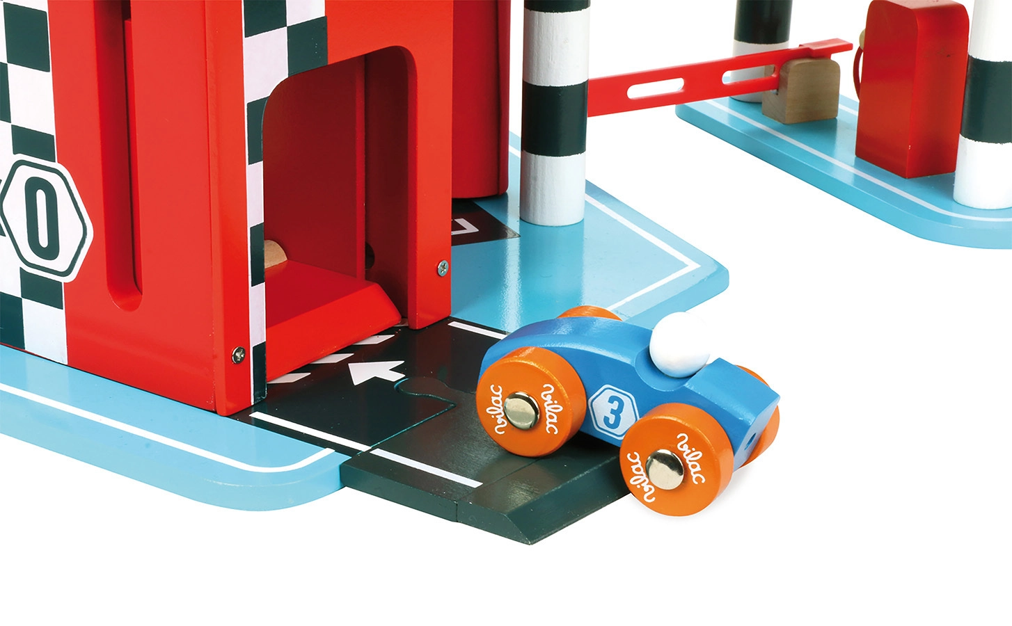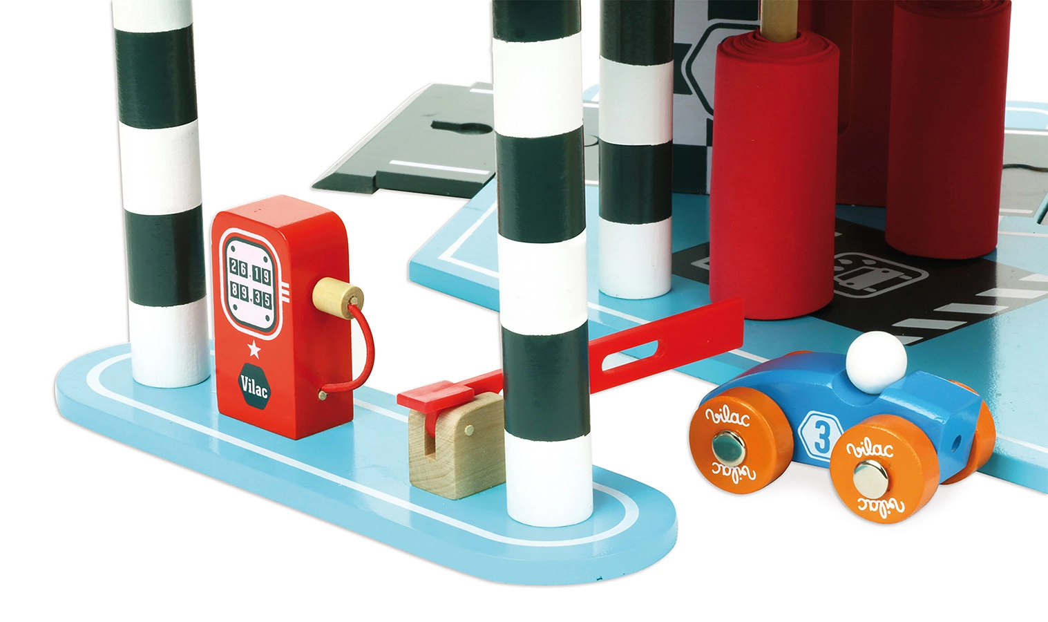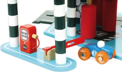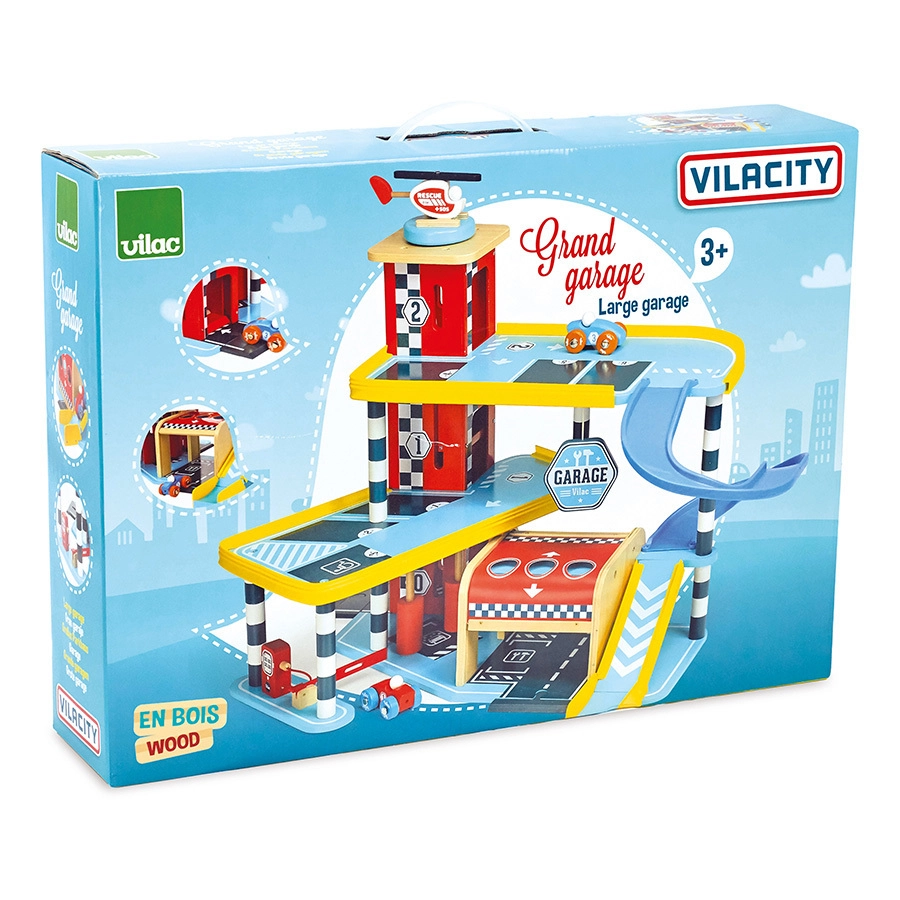 Lielā koka garāža VILAC Vilacity ir perfekts pilsētas satiksmes centrs visiem mazajiem braucējiem. Pateicoties pārdomātām mehāniskām detaļām, piemēram, darbojošam liftam, barjerai un mazgātavai, bērni attīsta smalko motoriku, iztēli un loģisko domāšanu. Komplektā ir divas mašīnītes un helikopters, tāpēc spēle var sākties uzreiz pēc salikšanas.