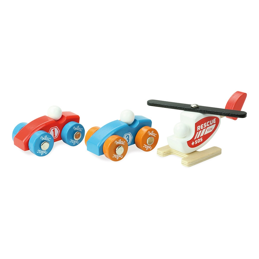 - Bagātīgs piederumu komplekts: 2 mašīnītes un helikopters iepakojumā