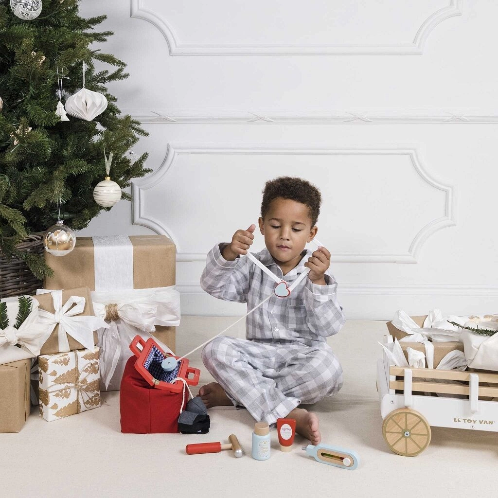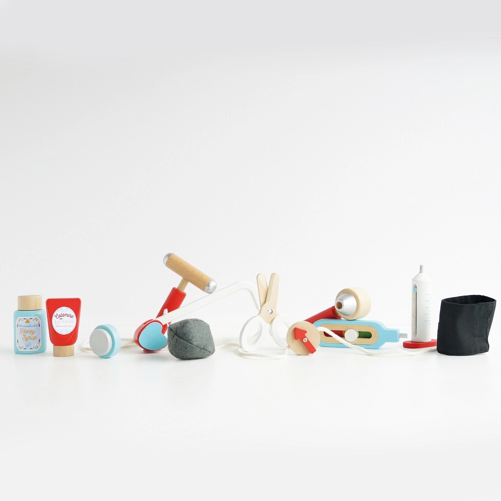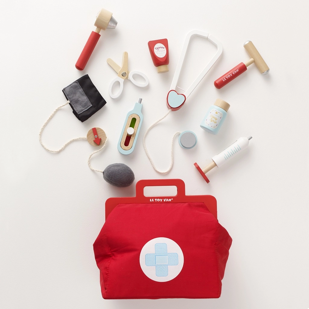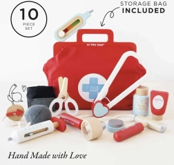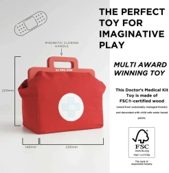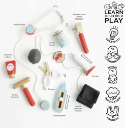 Stilīgs ārsta komplekts mazajiem dakteriem tekstila somā ar koka rokturiem piedāvā visu nepieciešamo rotaļām “ārsta kabinetā”. Kopā 10 detaļas, tostarp stetoskops, termometrs un šļirce. Rotaļlieta ir dzimumneitrāla, veicina sīko motoriku, iztēli un kognitīvās prasmes. Izgatavota no ilgtspējīga FSC sertificēta koka un roku darbs ar netoksiskām, ūdens bāzes krāsām.