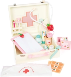 Mīlīgs ārsta koferītis mazajiem dakteriem piedāvā 24 koka piederumus, tostarp stetoskopu, termometru un šļirci. Spēļu komplekts ar zemeņu motīvu veicina radošumu, saziņu un bērnu fantāzijas attīstību. Praktiskais koferītis ar rokturi uztur visu kārtībā ērtai pārnēsāšanai un novietošanai.