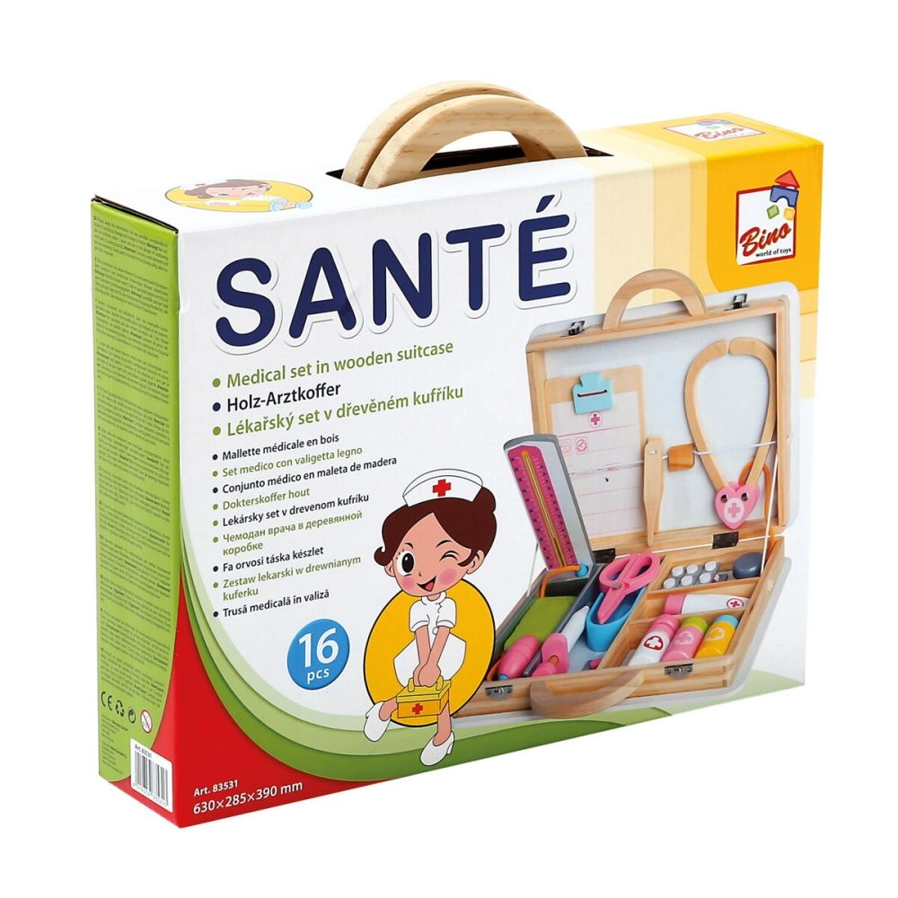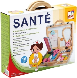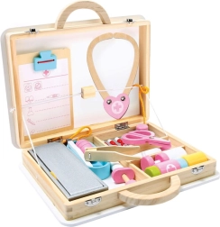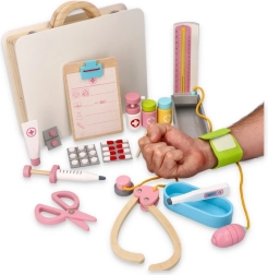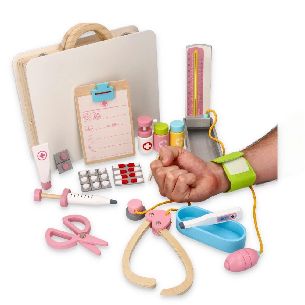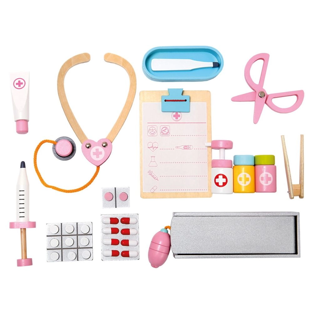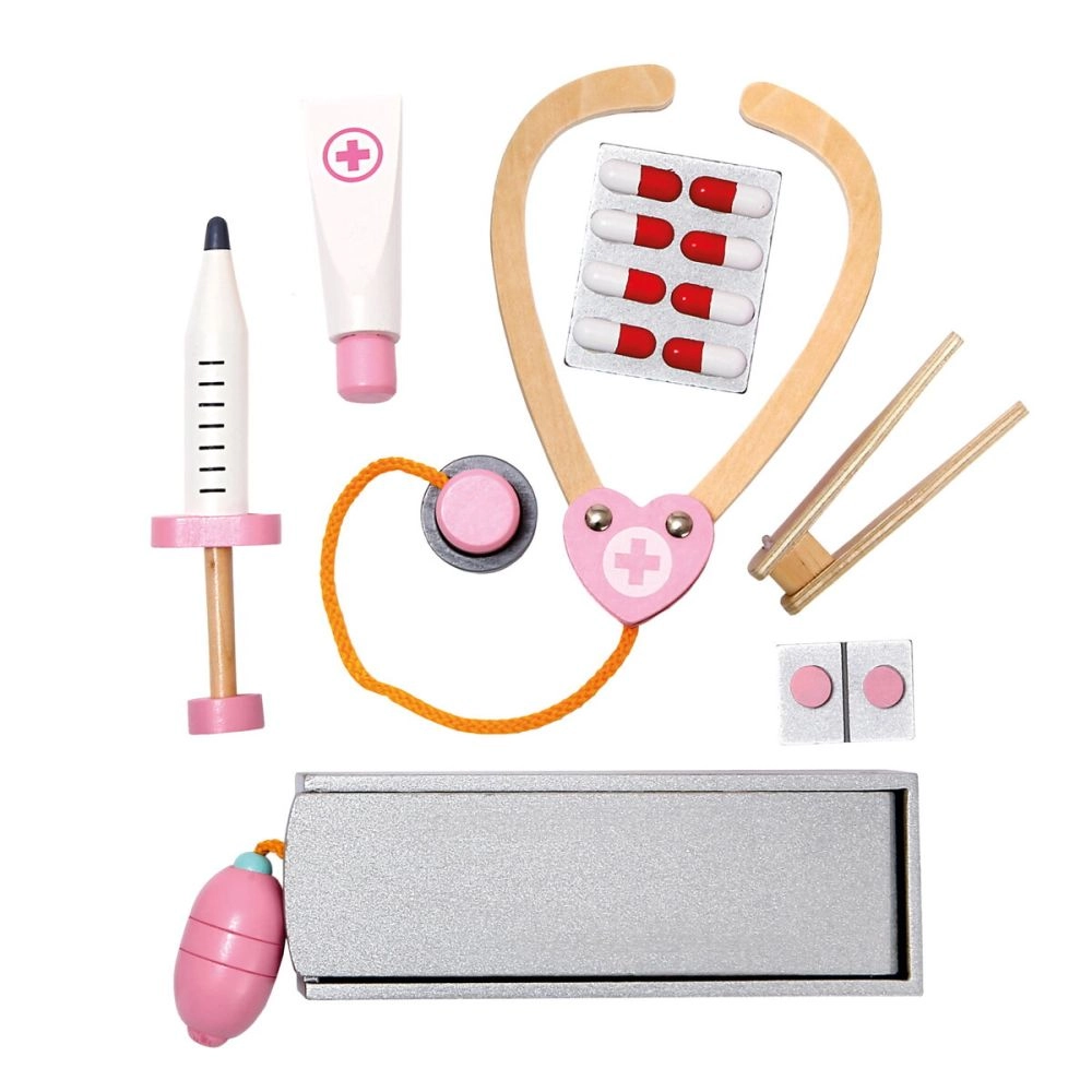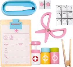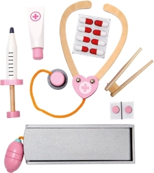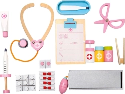 Komplektā iekļauti koka instrumenti, piemēram, stetoskops, šļirce un citas palīgierīces, kas veicina reālistisku spēli.