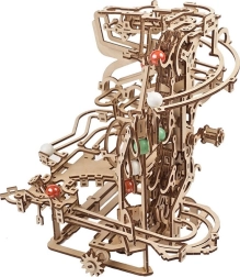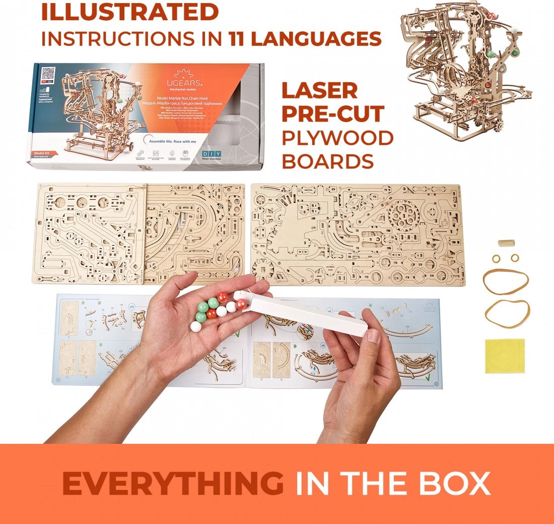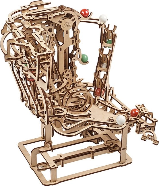 Atklājiet izklaidi un tehnisko eleganci ar UGEARS – koka mehānisko bumbiņu trasi ar ķēdes piedziņu. Roku darbināms mehānisms iedarbina krāsainās bumbiņas pa trim unikālām sekcijām ar šķēršļiem, savukārt atklātā konstrukcija ļauj apbrīnot zobratus un pārnesumus darbībā. Moduli var savienot ar citām komplektiem vēl iespaidīgākai trasei. Lieliska izvēle radošiem entuziastiem, kuri mīl izaicinājumus un precīzus koka modeļus.