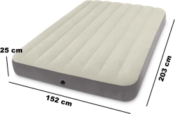 Divvietīgs uzpūšamais matracis INTEX ar izmēriem 203 × 152 × 25 cm ir lieliski piemērots mājām un kempingam. Tam ir patīkama velūra virsma, ātrais Boston vārsts ērtai uzpūšanai un izpūšanai un iekšējā Dura-Beam Fiber tehnoloģija labākam ķermeņa atbalstam. Komplektā ir remonta ielāps.