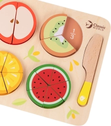 Koka griežamo augļu komplekts ir ideāli piemērots mazajiem, kuriem patīk spēlēties pavāros. Šis izglītojošais komplekts satur 23 dažādus elementus, tostarp dēlīti, nažiņu un sadalītus augļus, kas nodrošina nebeidzamas iespējas radošai spēlei un iztēles scenārijiem.