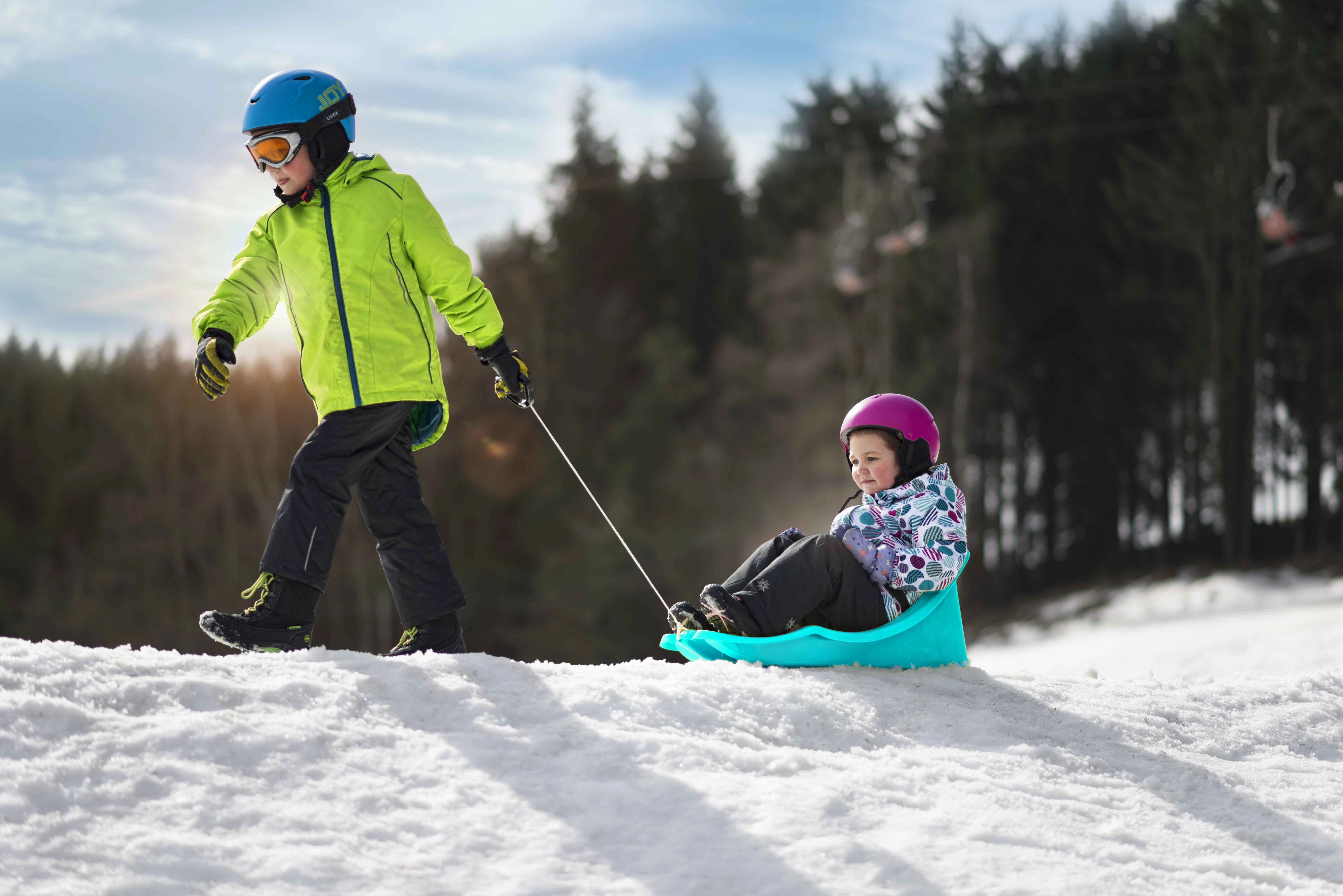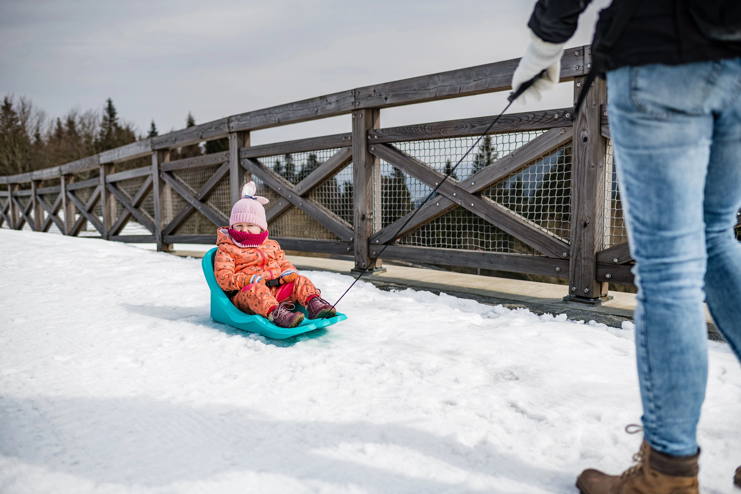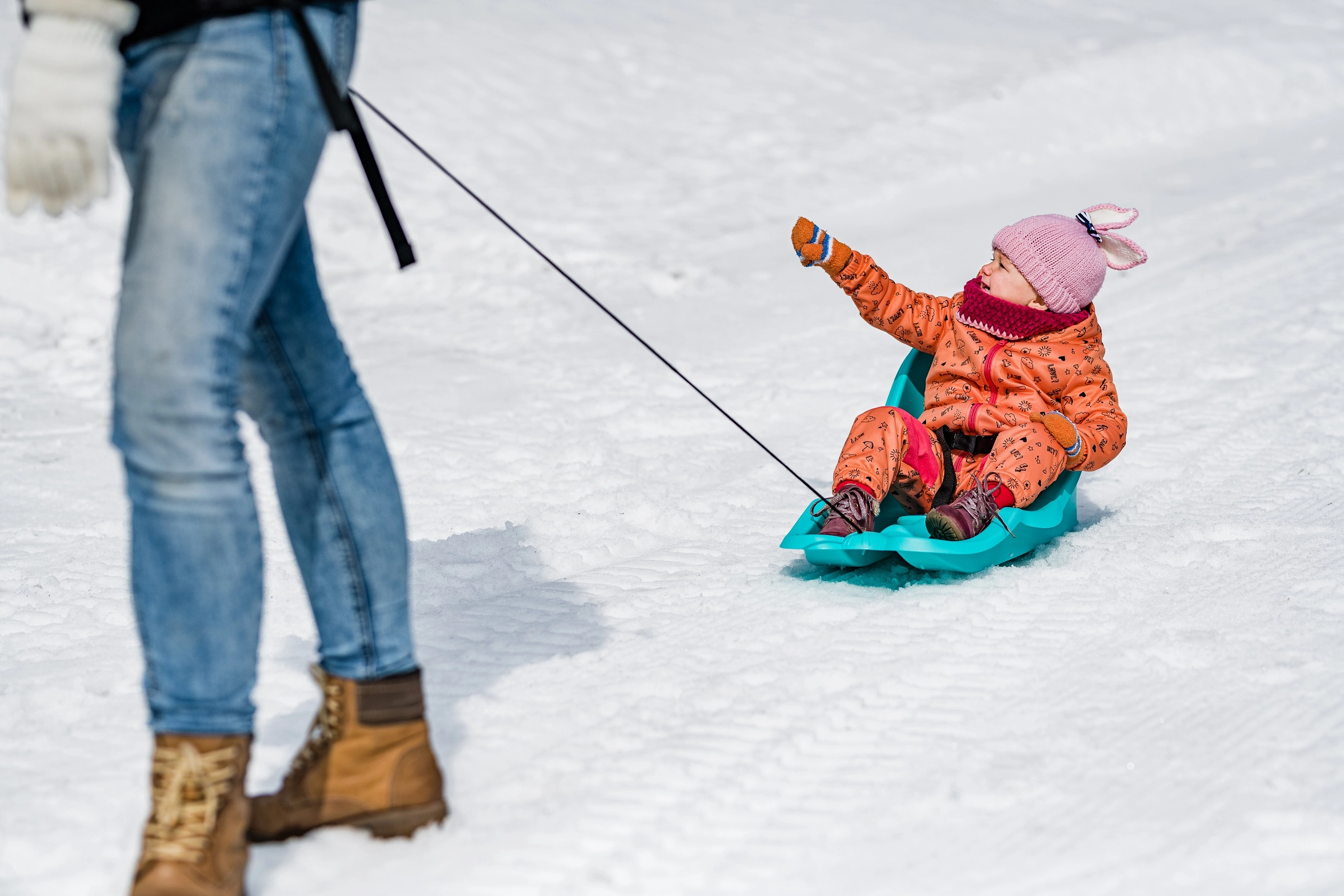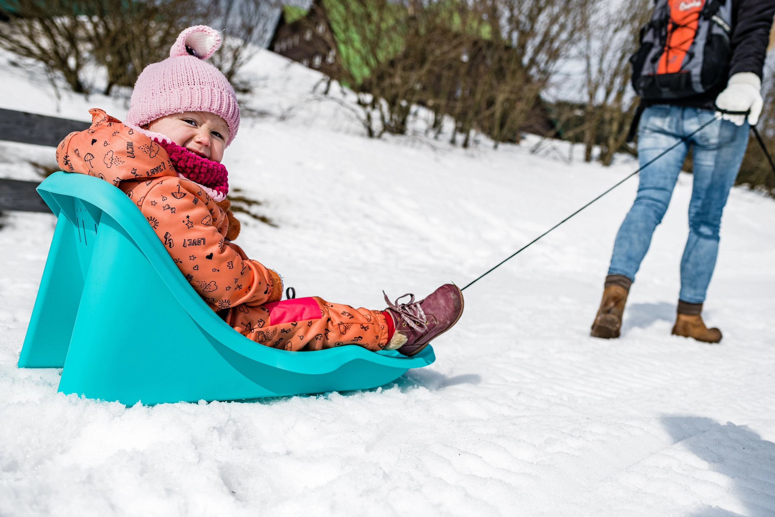 Praktiska vilkšanas aukla ar rokturi ļauj vecākiem ērti vilkt ragaviņas pa sniegu arī garākos maršrutos.