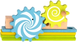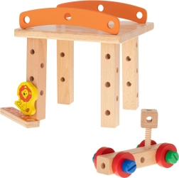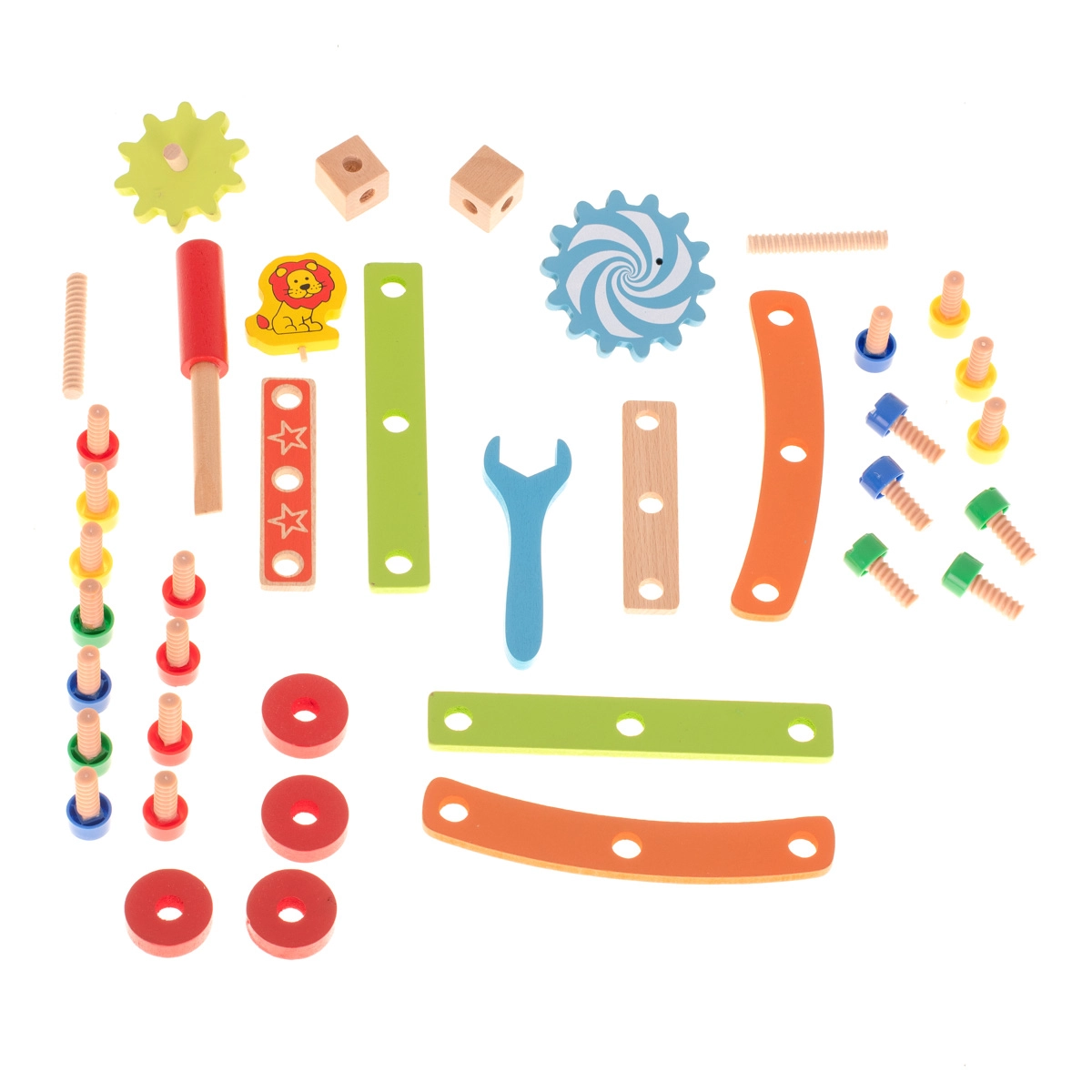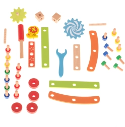Komplektā ir koka skrūvgriezis un atslēga, tāpēc mazajiem būvētājiem ir viss nepieciešamais. Košās detaļas ar rotaļīgiem motīviem (piem., lauvēns un zobrati) veicina radošu spēli un māca atpazīt krāsas. Lieliska izvēle kā izglītojoša rotaļlieta un dāvana, kas izklaidēs stundām.