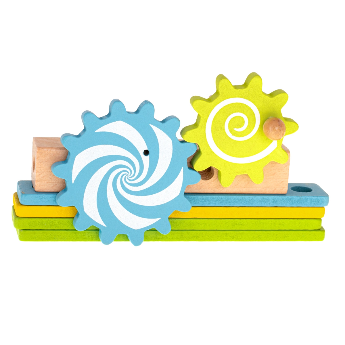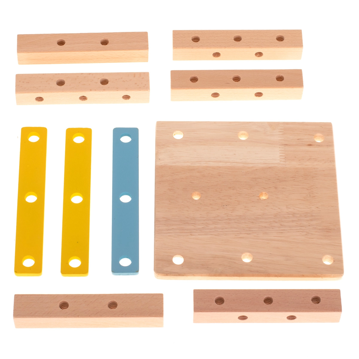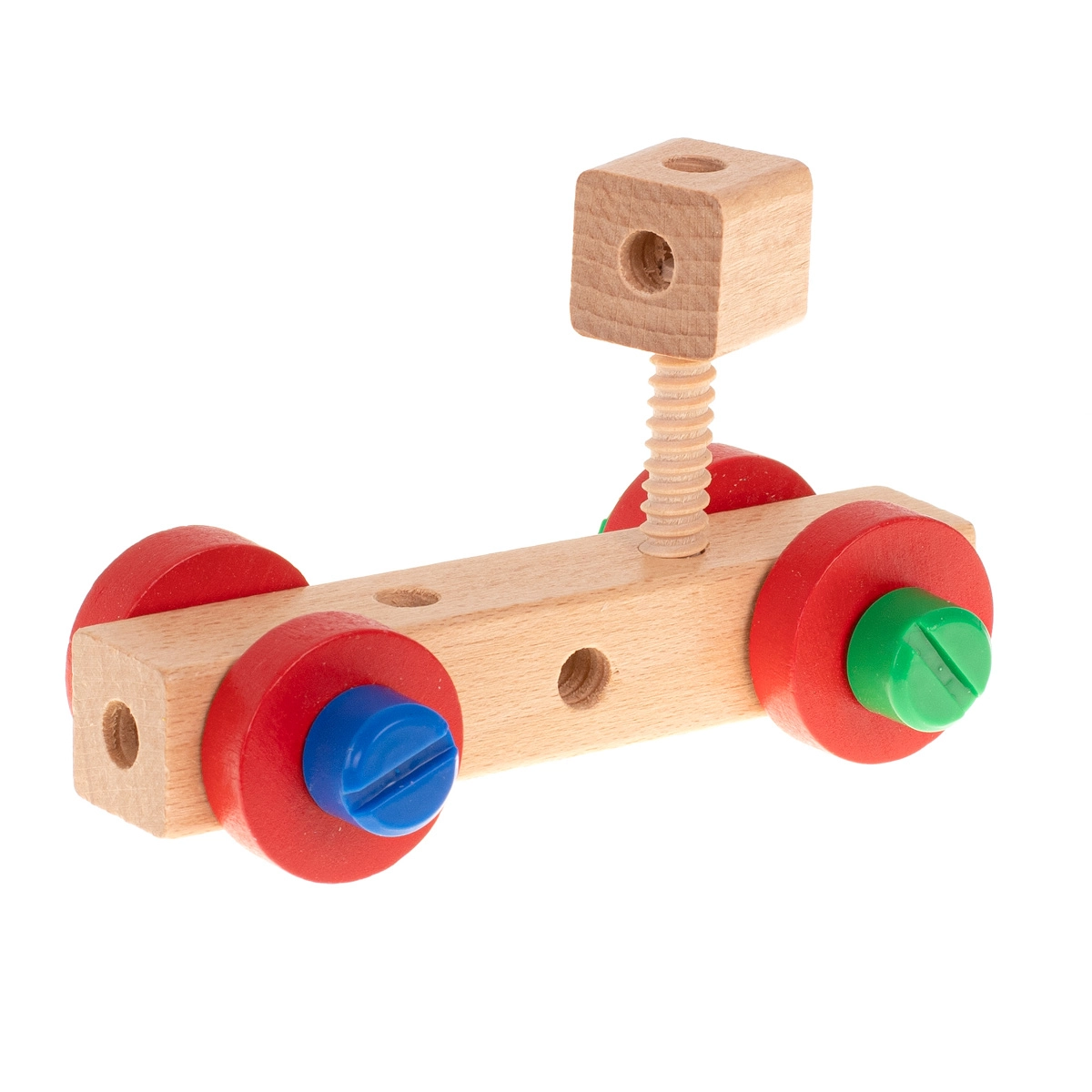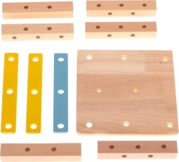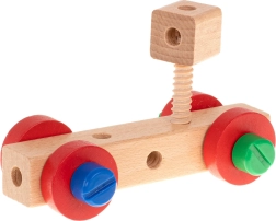 Komplektā ir koka skrūvgriezis, atslēga, skrūves un uzgriežņi – bērni apgūst pareizu detaļu savienošanu un attīsta smalko motoriku.