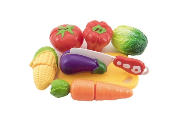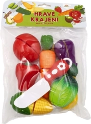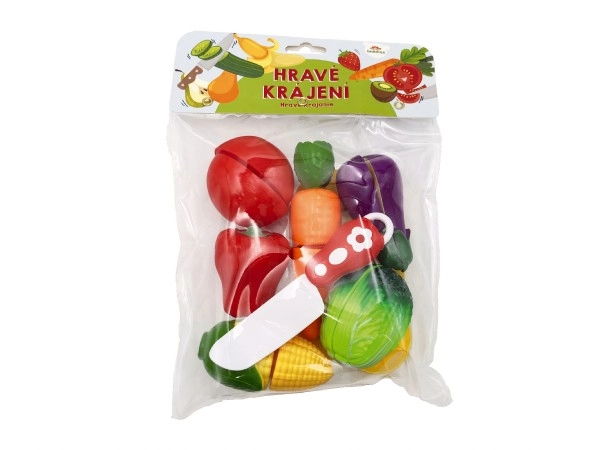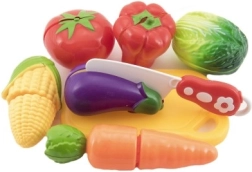 Šis košais komplekts mazajiem pavāriem piedāvā reālistisku gatavošanas pieredzi. Atsevišķās augļu un dārzeņu daļas ir savienotas ar lipekļlenti, tāpēc bērni tās var atkārtoti sadalīt un salikt, izmantojot komplektā iekļauto nazi. Izturīgā plastmasas izgatavošana ir viegla un droša bērnu rotaļām.