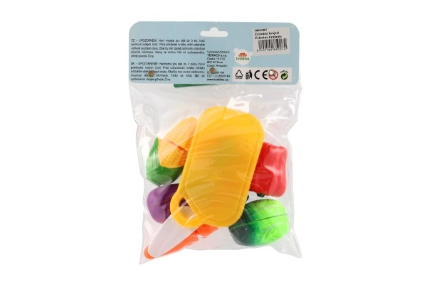 - Komplekta saturs: dēlītis, nazis, dažādi augļi un dārzeņi ar lipekļlenti