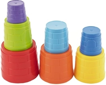 Krūzītes var celt augstā tornī vai ievietot vienu otrā. Bērni tā attīsta sīko motoriku, koordināciju un loģisko domāšanu.