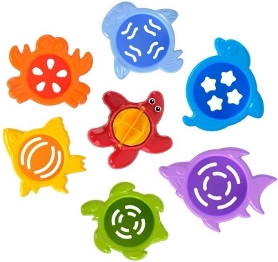 Atklājiet krāsainu stohējamo kausiņu komplektu ar jūras dzīvnieku motīviem, kas bērniem sniegs stundām ilgu izklaidi vannā un smilšu kastē. Septiņas daļas precīzi ieguļ cita citā, no tām var būvēt torni, un, pateicoties atverēm, tās ir ideāli piemērotas ūdens spēlēm. Atbalsta sīko motoriku, acu–roku koordināciju un krāsu atpazīšanu jau no 12 mēnešu vecuma.