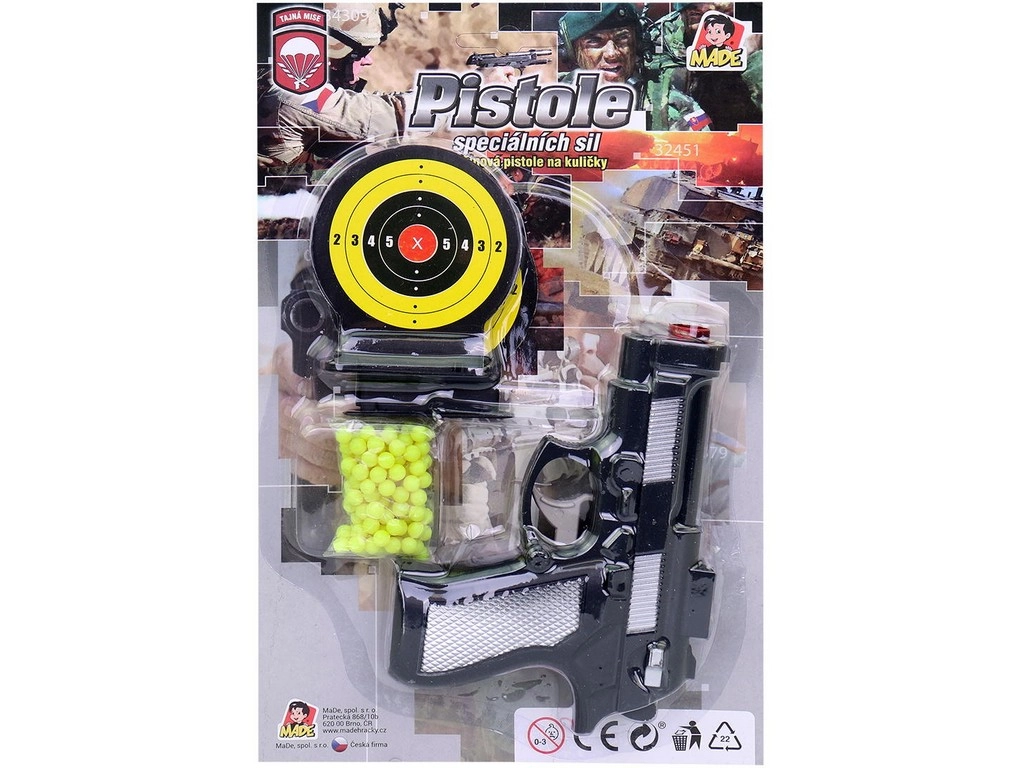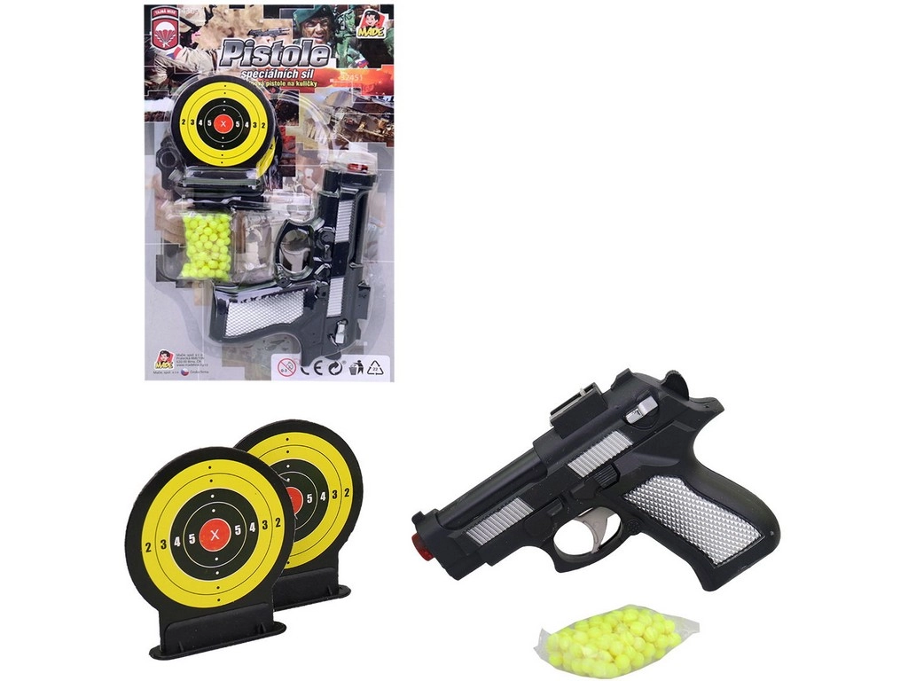 Izklaidējoša bērnu bumbiņu pistole ar diviem mērķiem sniedz daudz aktivitāšu un treniņa precizitātei. Kompakts 15 cm izmērs ir ideāli piemērots mazai bērna rokai, izturīgais plastmasas materiāls nodrošina vieglumu un ērtu lietošanu. Lieliska izvēle bērniem no 3 gadiem ar iepakojumu čehiskā dizainā.
