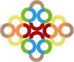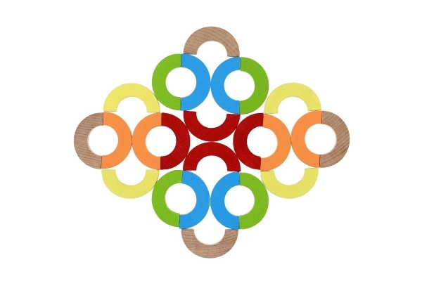 Šī daudzpusīgā koka mozaīka piedāvā bezgalīgas spēļu iespējas – no torņu un tiltu būvēšanas līdz simetrisku rakstu veidošanai un līdzsvara uzdevumiem. Izturīgās, gludi slīpētās detaļas spilgtās krāsās aicina izzināt un māca bērniem koncentrēšanos un acu–roku koordināciju.