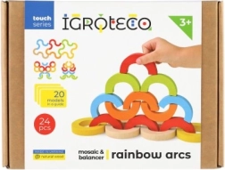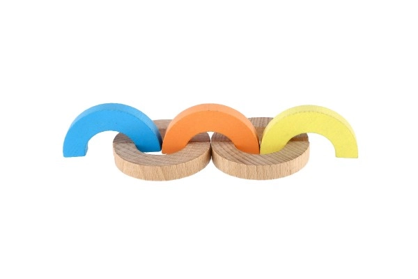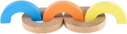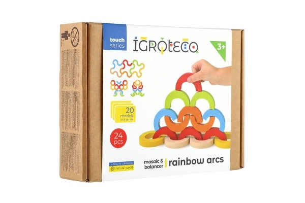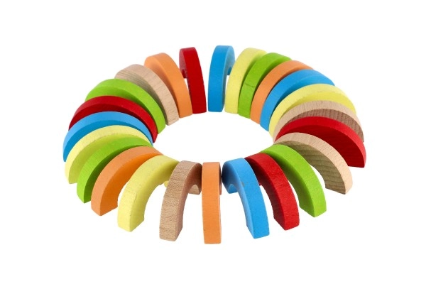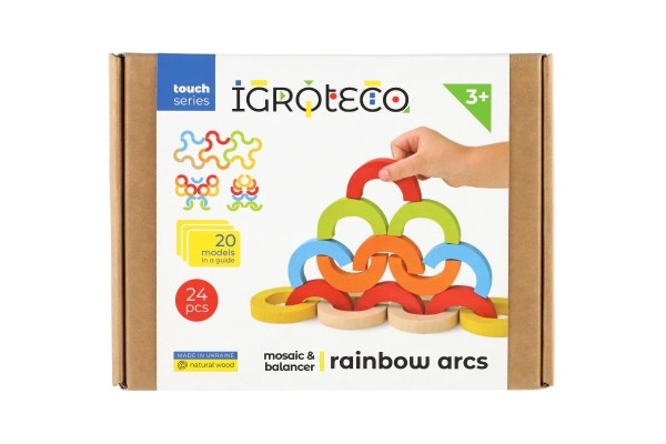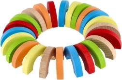 Atklājiet radošu konstruktoru no kvalitatīva koka – varavīksnes loku komplekts ar 24 detaļām bērniem no 3 gadu vecuma. Veicina sīko motoriku, līdzsvara prasmes un radošo domāšanu. Bērni var celt augstumā, veidot krāsainus rakstus un vienkāršas spēles, tā attīstot telpisko iztēli un pacietību.