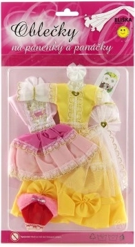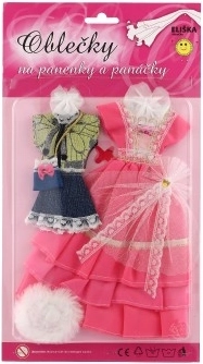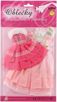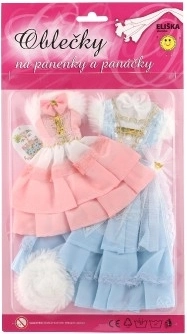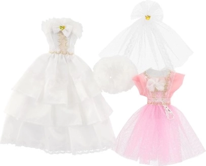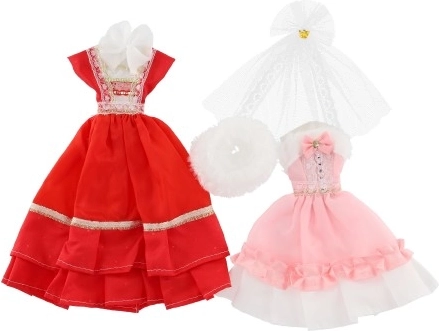 Divi atšķirīgi kleitu komplekti, katrs ar savām detaļām, kas piešķir katrai lellei izteiksmīgu izskatu.