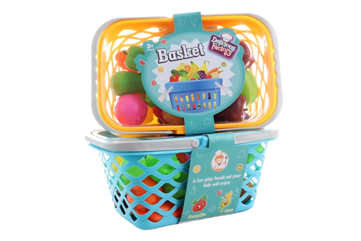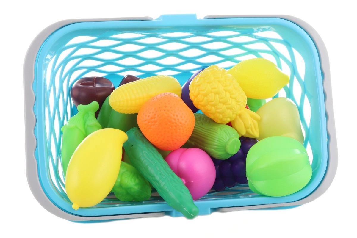 Šis krāsainais plastmasas augļu un dārzeņu komplekts groziņā iepriecinās ikvienu mazo gatavošanas un iepirkšanās cienītāju. Groziņš ar ventilējamu režģi un vāku kalpo kā ērta glabātuve un pārnēsājama somiņa, lai bērni varētu paņemt savu aprīkojumu jebkurai spēlei.
