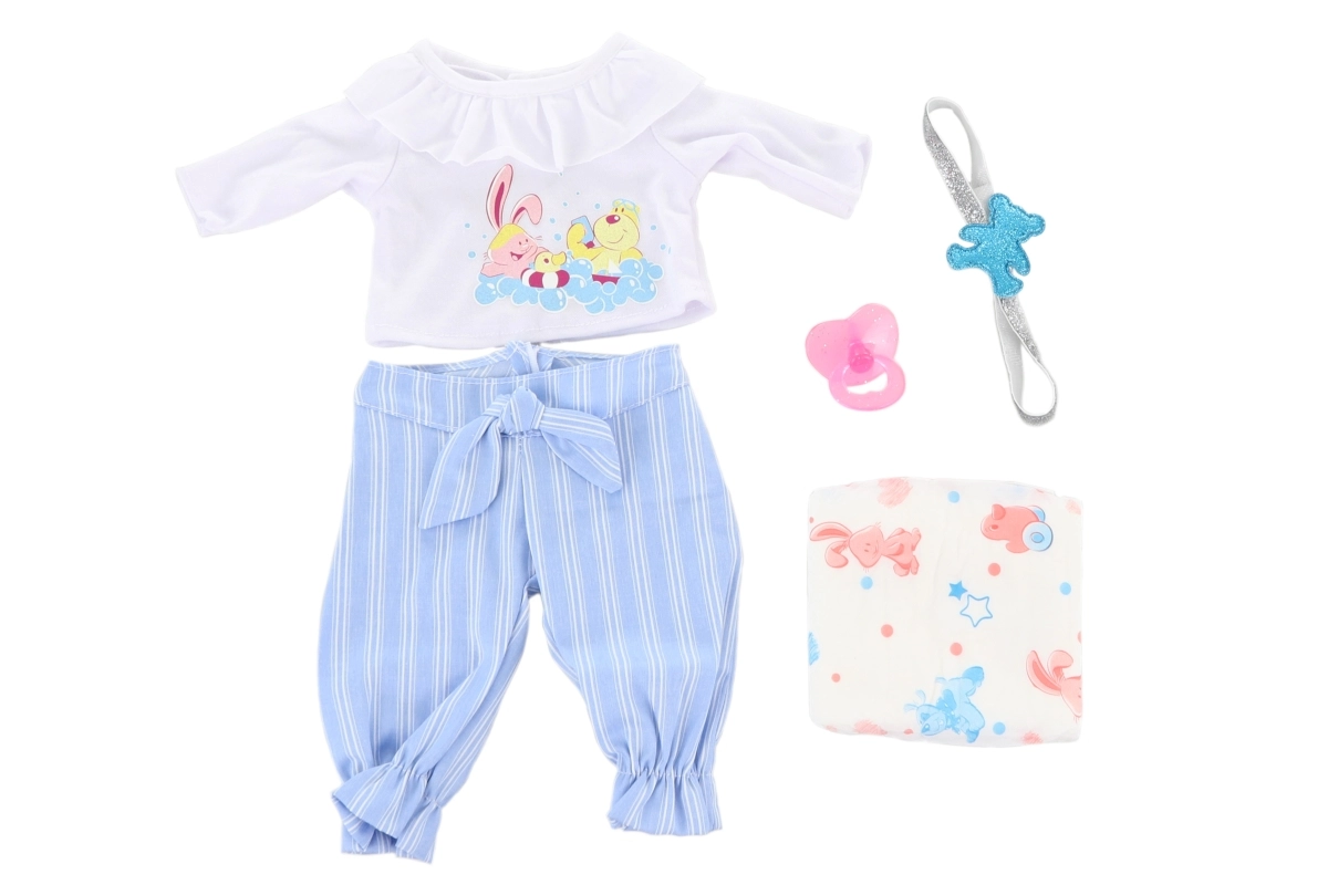 Uzdāvini savai lellei jaunu tērpu un bērniem nebeidzamas spēļu iespējas. Apģērbs ir paredzēts lellēm ar augstumu aptuveni 45 cm un der lielākajai daļai šī izmēra leļļu. Pateicoties pārdomātajam piegriezumam, apģērbšana ir vienkārša pat mazākiem bērniem.
