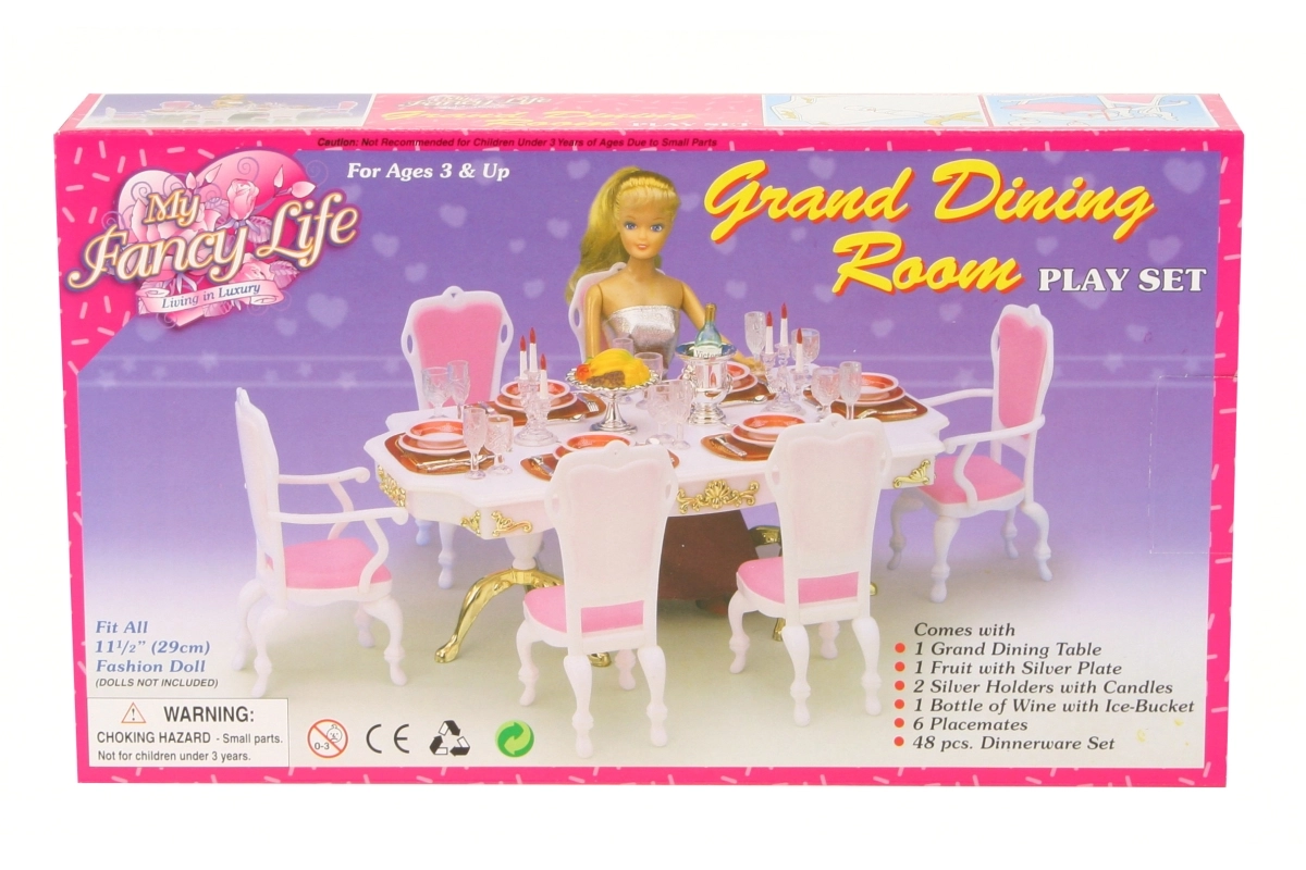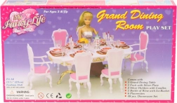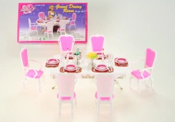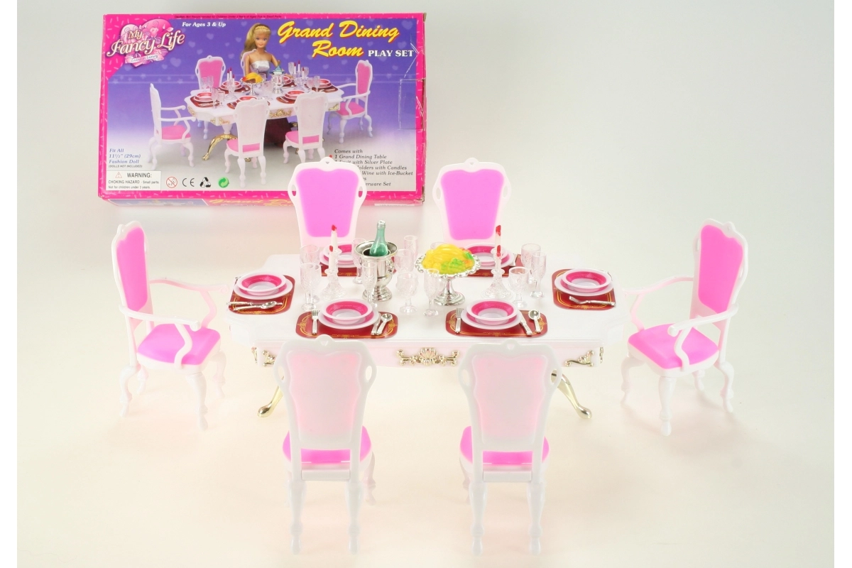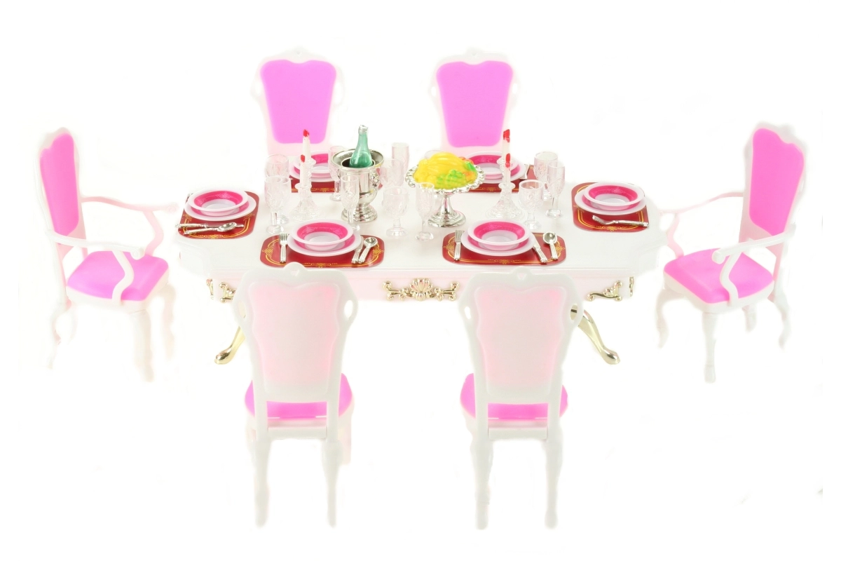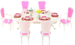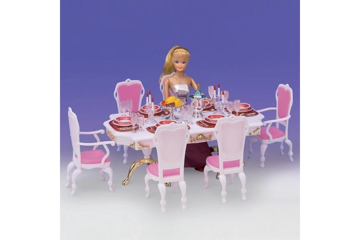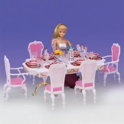 Stilīgais Glorie komplekts leļļu galda klāšanai pārvērtīs jebkuru istabu elegantā ēdamistabā. Komplektā ietilpst liels plastmasas galds, 6 krēsli (2 ar roku balstiem) un bagātīgs galda klājums, tostarp glāzes, šķīvji un galda piederumi. Ideāli piemērots radošai spēlei bērniem no 3 gadiem.