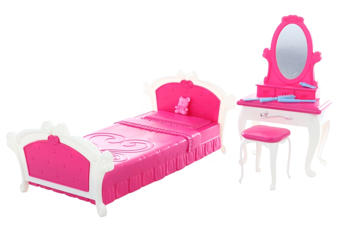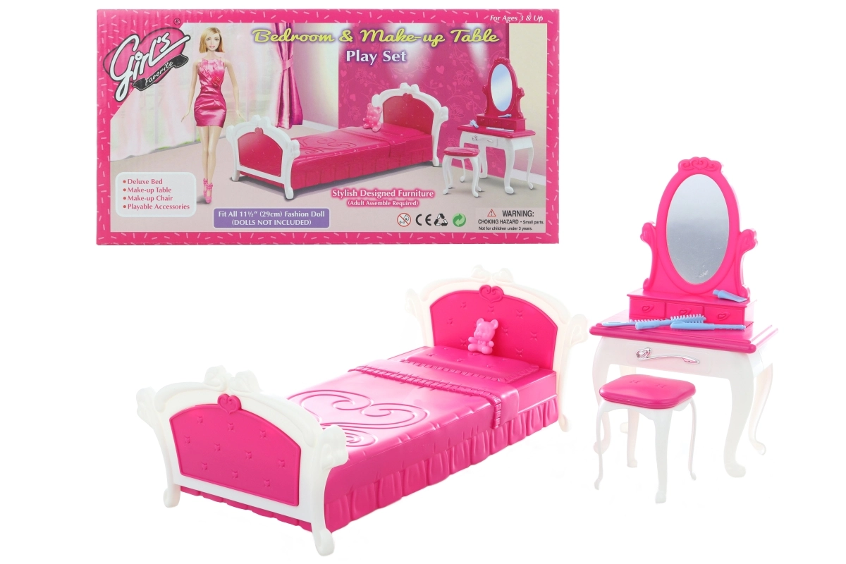 Stilīgs komplekts leļļu bērnistabai ar plastmasas gultu un kosmētikas galdiņu ar piederumiem. Ideāli piemērots radošai spēlei no 3 gadu vecuma. Komplektā ir ķemme, krēms, birste un taburete. Lelle nav iekļauta komplektā.